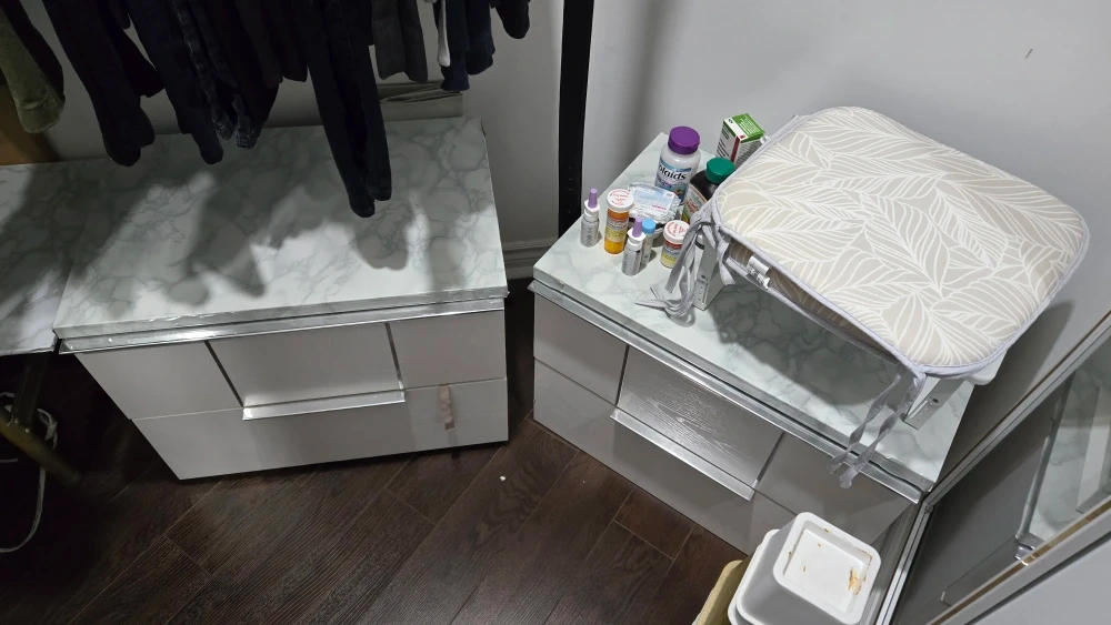 Selling a pair of nightstands. They're white with a marble-look top and silver accents. They have two drawers for storage. Perfect for adding a touch of modern style to your bedroom! Each for 30 dollars. Both together for 50 dollars