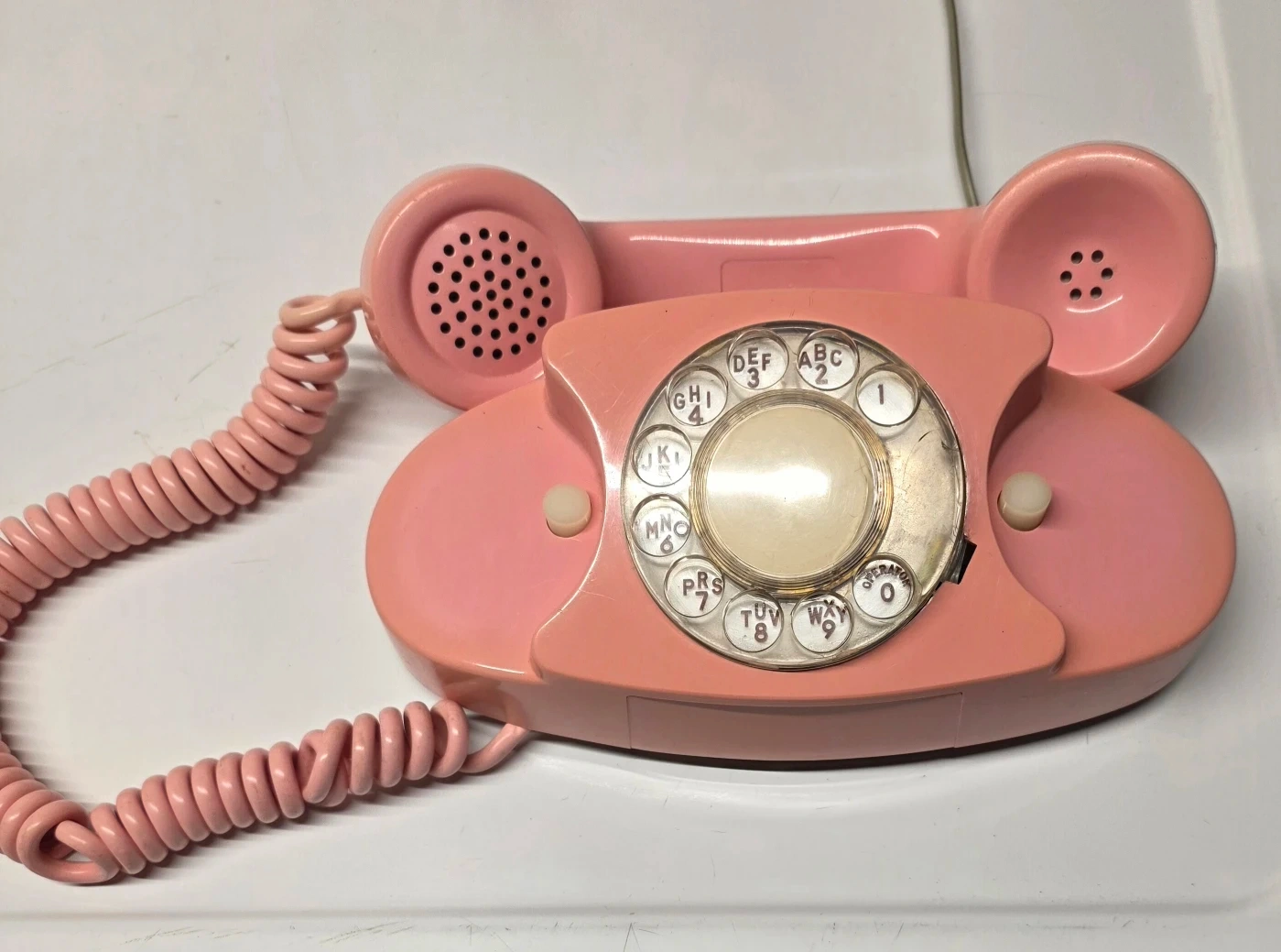 Selling a vintage pink rotary dial telephone! It's a real retro piece that would look great as a decorative item. The phone has a classic design with a rotary dial and a lovely pink colour. It's in good condition for its age, with some minor signs of wear.