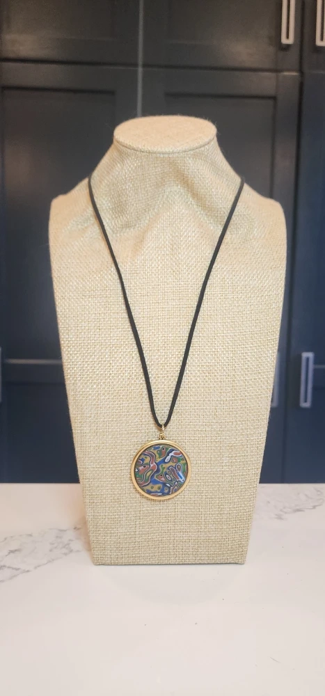 This is a vintage-style pendant necklace with a unique design. The pendant features a colourful, abstract pattern set in a gold-tone frame, complemented by a black cord. It's a lovely piece to add a touch of retro flair to any outfit!