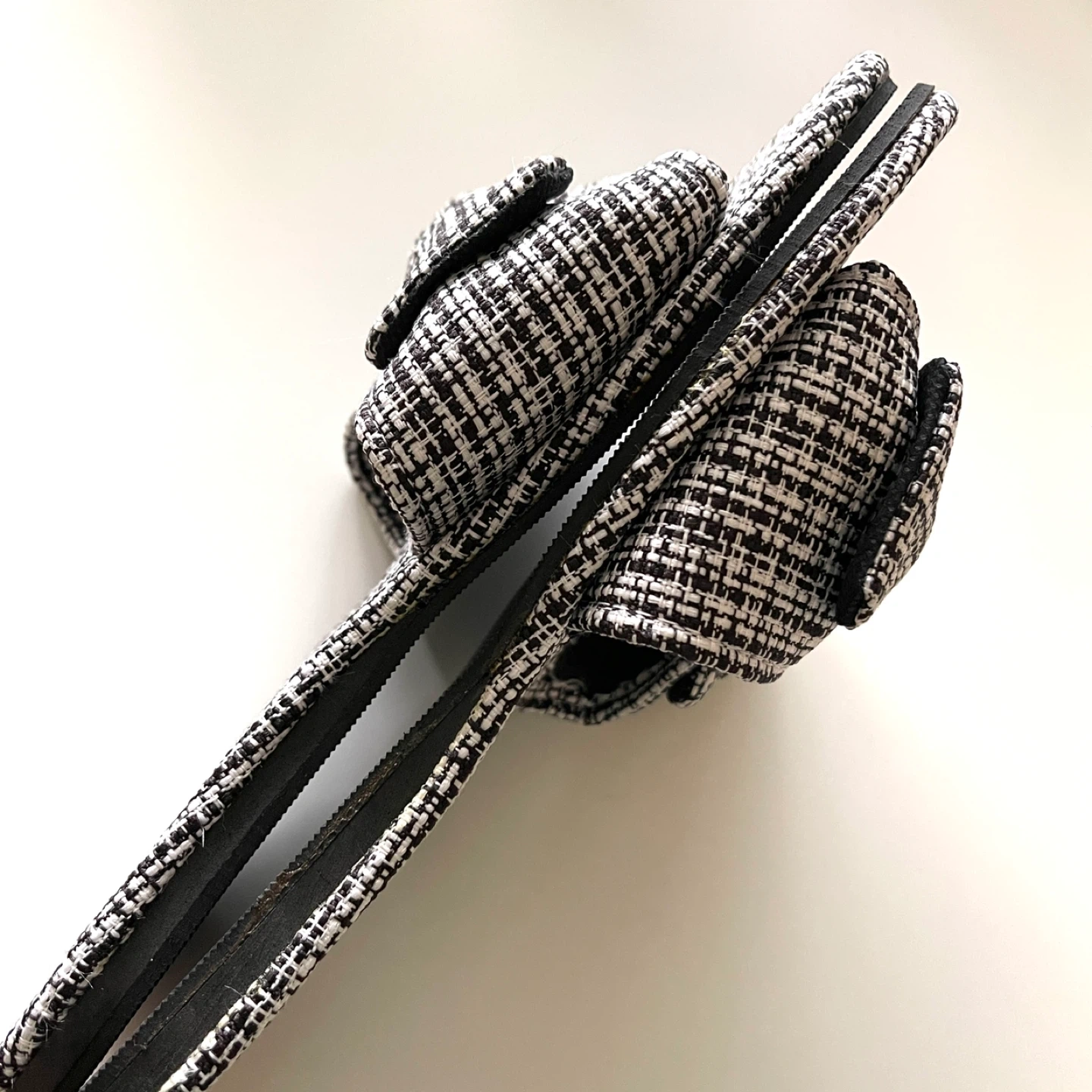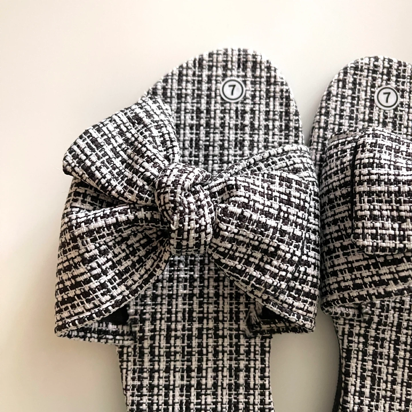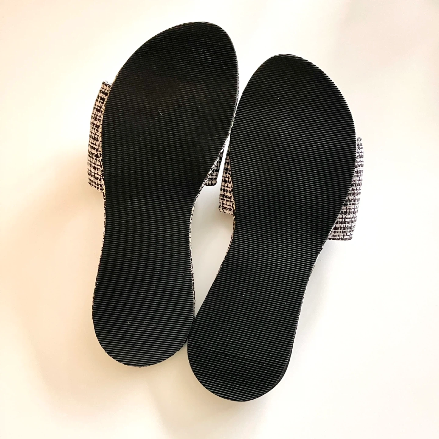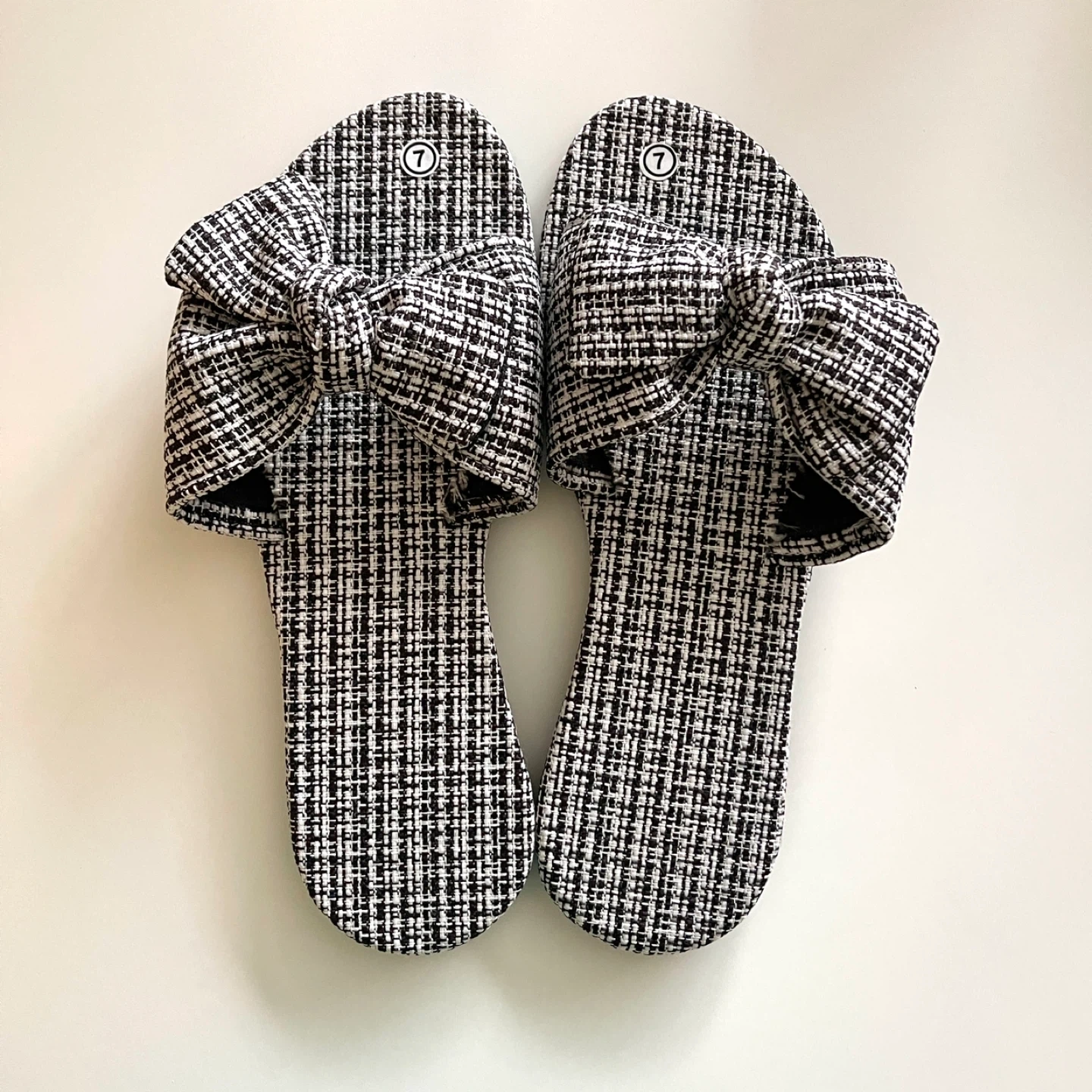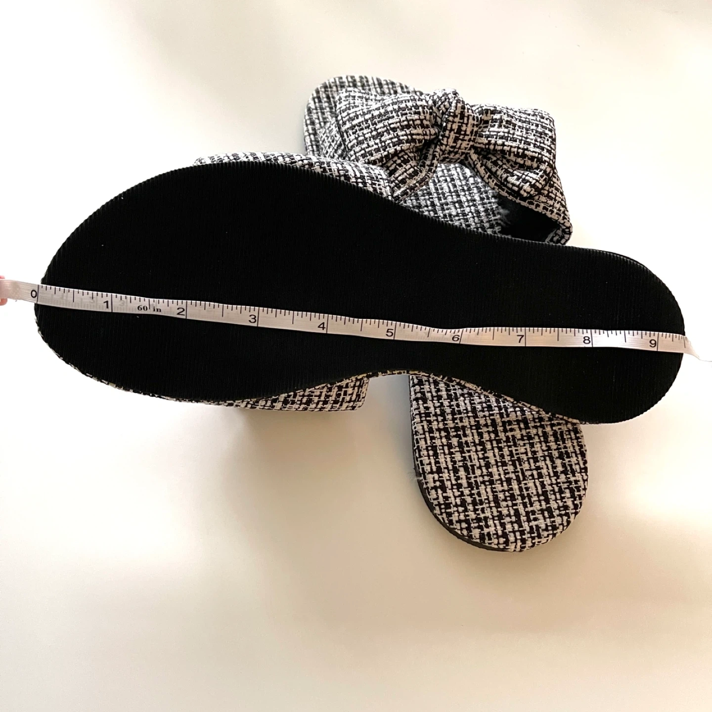 Cute pair of bow accent slides! They have a black and white woven pattern. The sole measures approximately 9.5 inches in length.