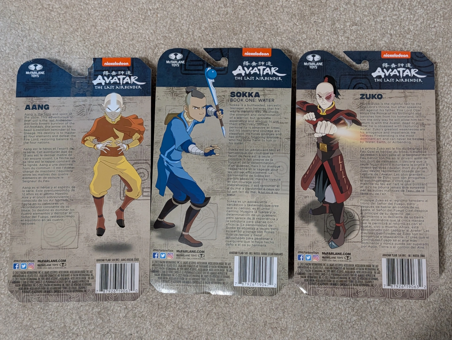 I'm selling a set of new Avatar: The Last Airbender figures by McFarlane Toys! This includes Aang, Sokka, and Zuko, all still in their original packaging. These figures are recommended for ages 6+ and would make a great addition to any Avatar collection. Selling as a Set only. Not individual items.