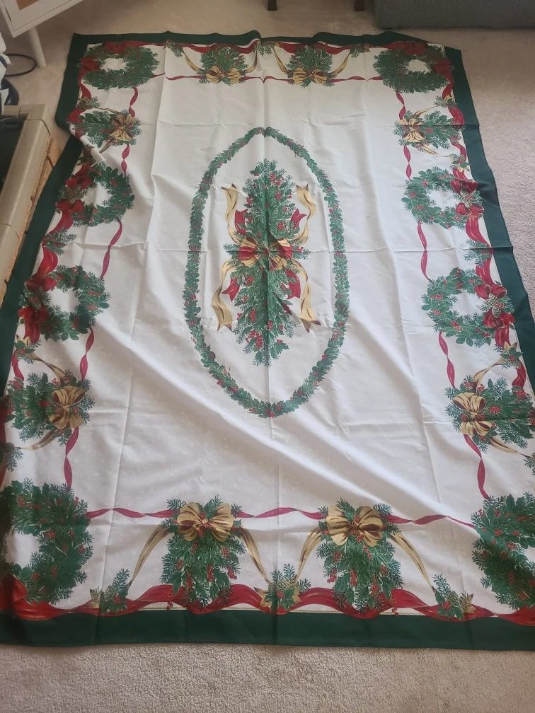 Selling a vintage Christmas tablecloth and a set of Christmas plates! They're in great condition and would be perfect for your holiday gatherings. The tablecloth features a festive wreath and ribbon design, and the plates have a charming Christmas tree scene. Add a touch of vintage charm to your holiday table!