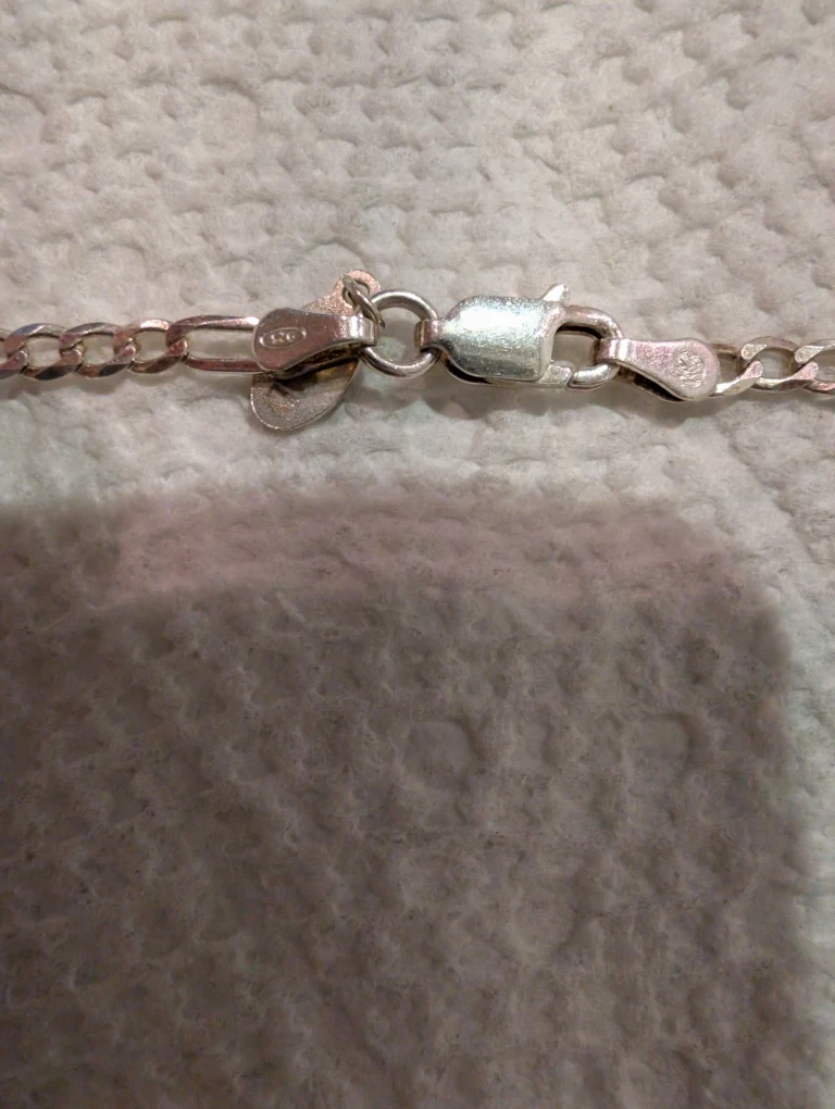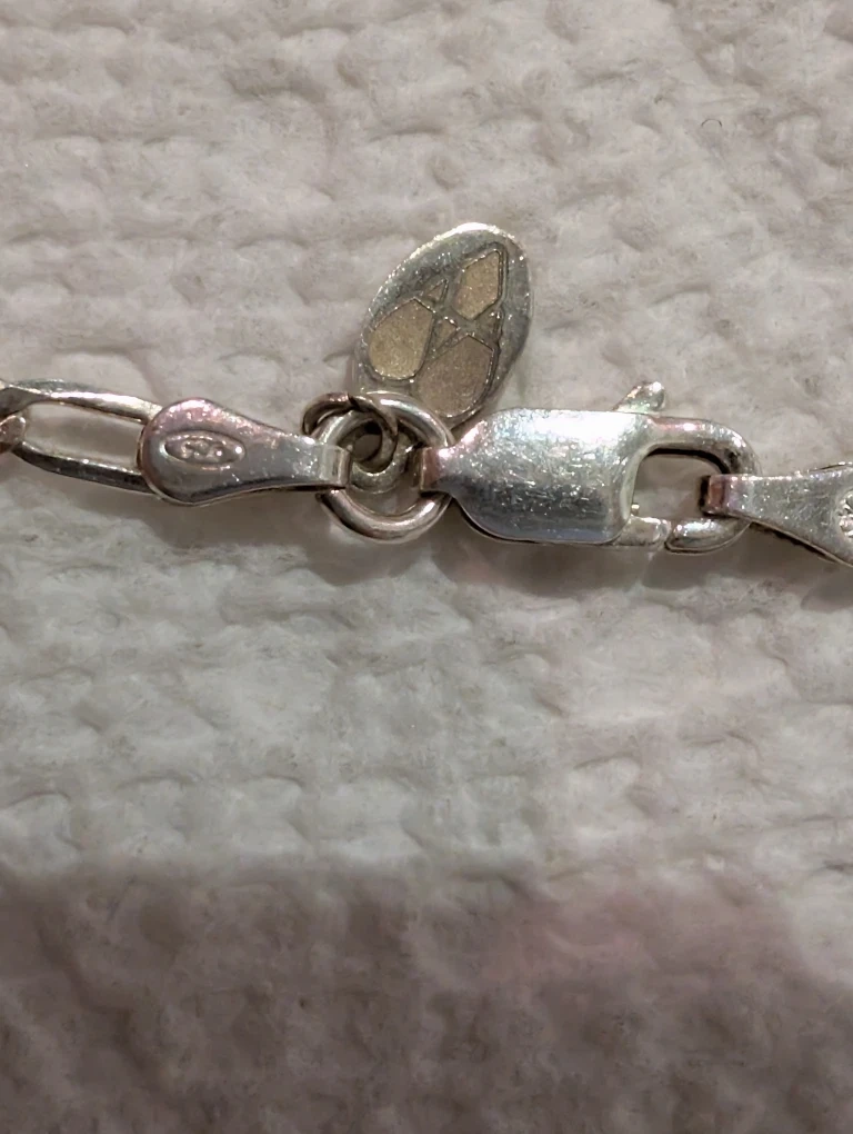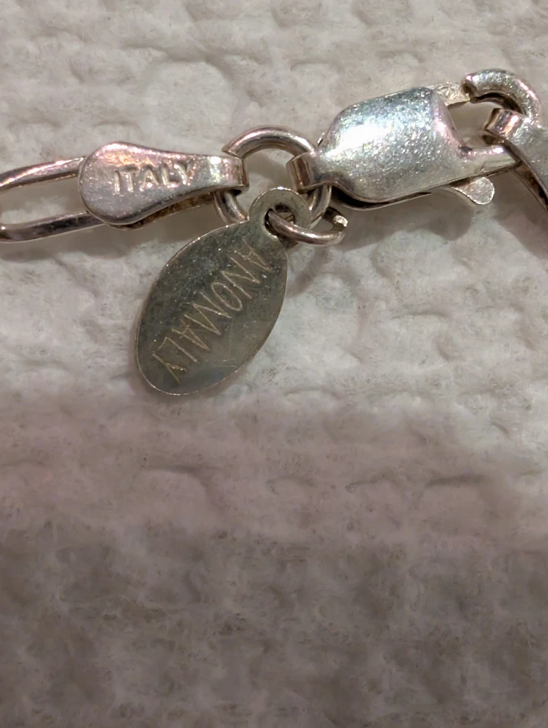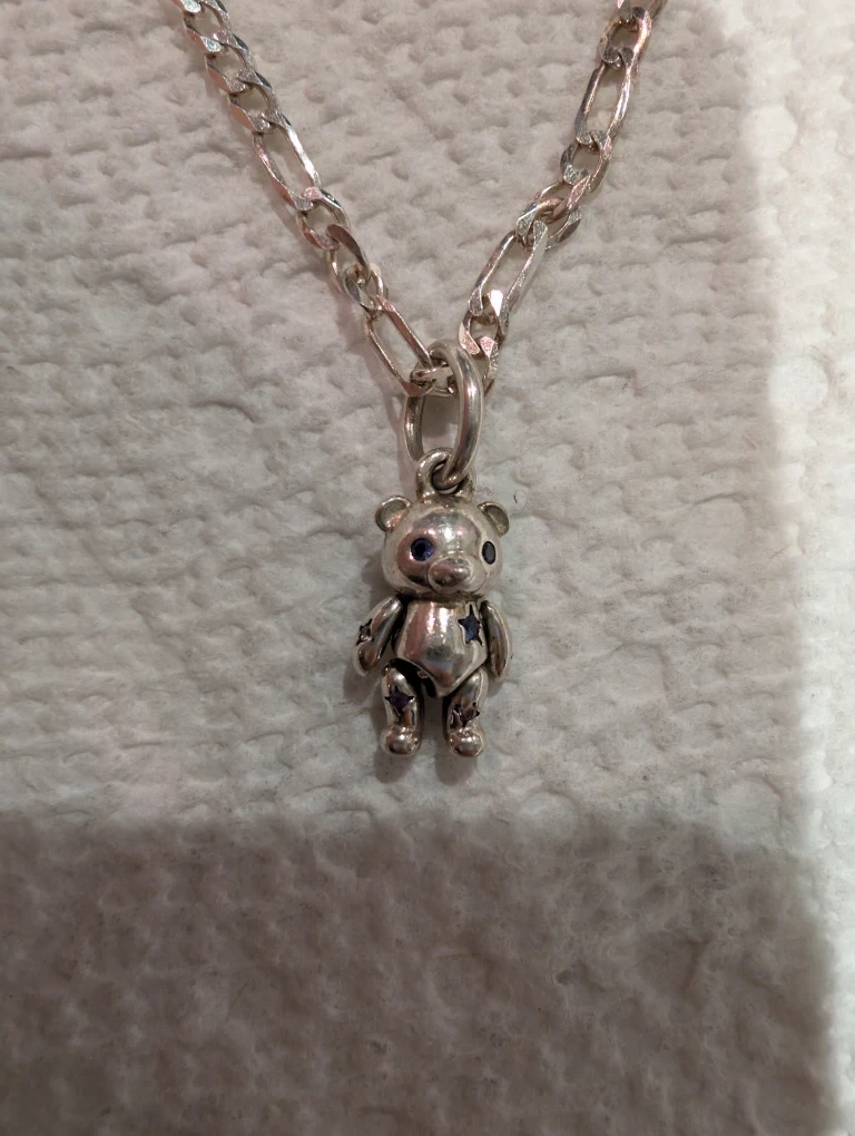 Here's a cute silver necklace with a teddy bear pendant from Anomaly 925 Italy length 16" inch and weight 7.16 grams Figaro chain solid sterling silver Links