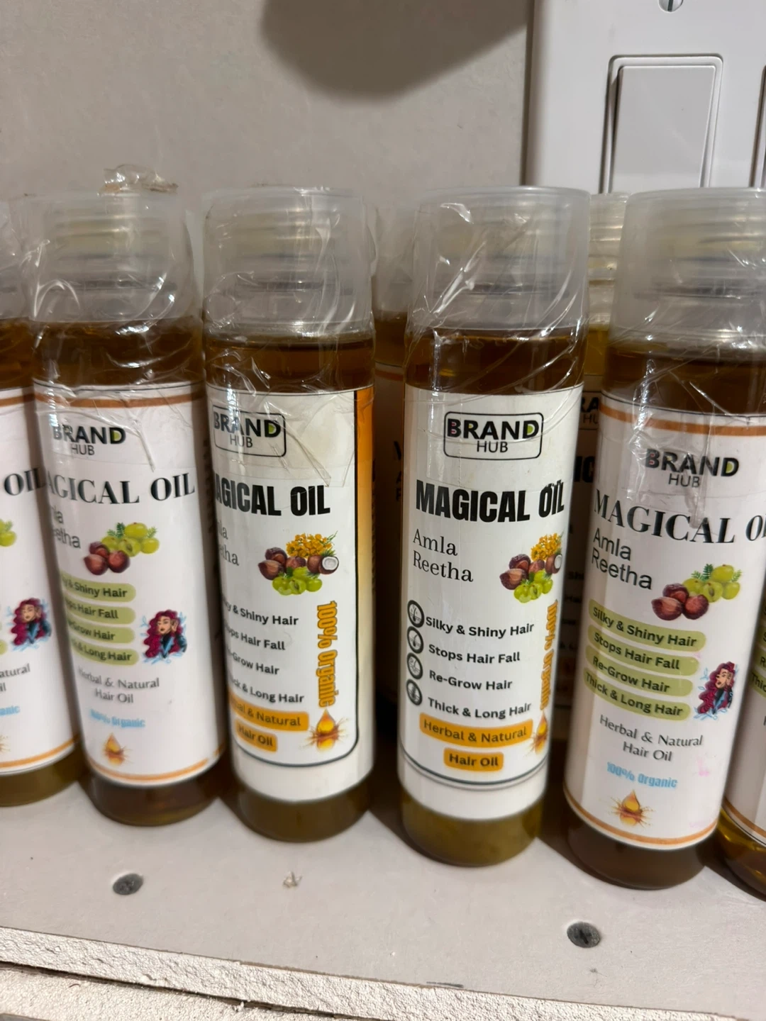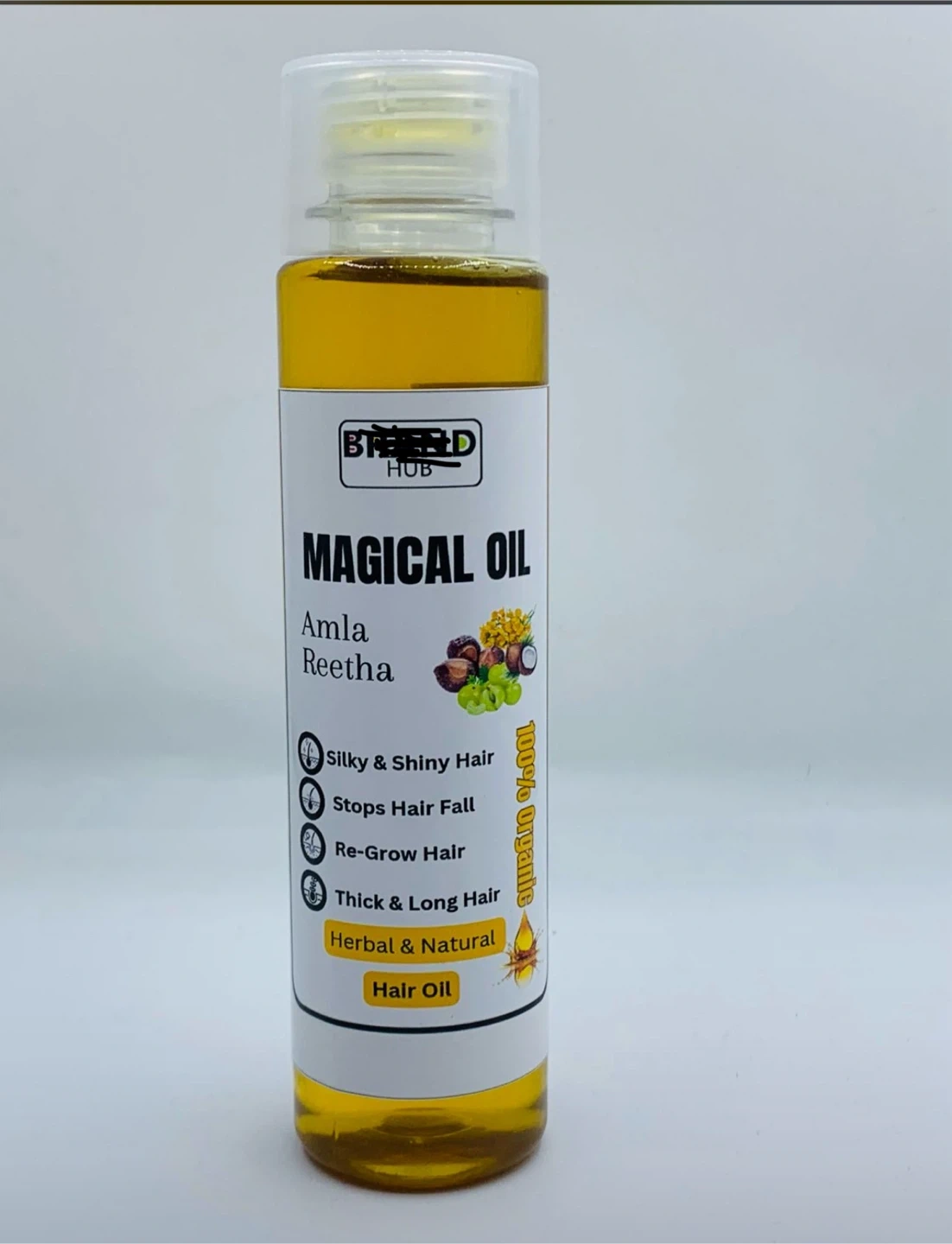Brand Hub Magical Oil, made with Amla and Reetha, is designed to give you silky and shiny hair. It's also formulated to help stop hair fall, re-grow hair, and promote thick and long hair. This herbal and natural hair oil is 100% organic
