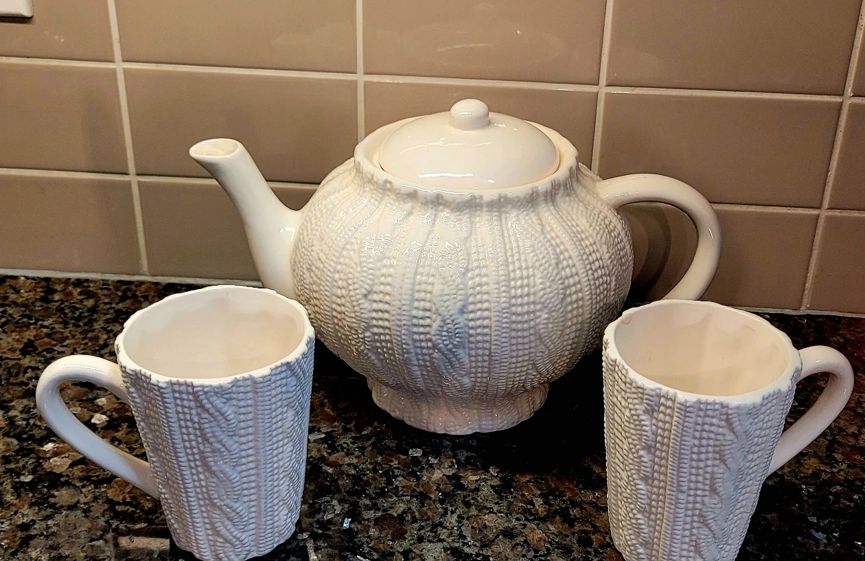 Lovely teapot and mugs, cable-knit sweater design