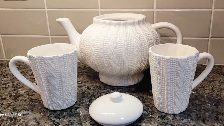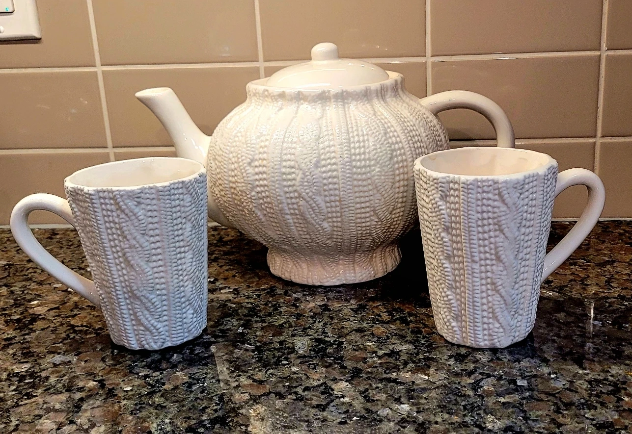 Lovely teapot and mugs, cable-knit sweater design