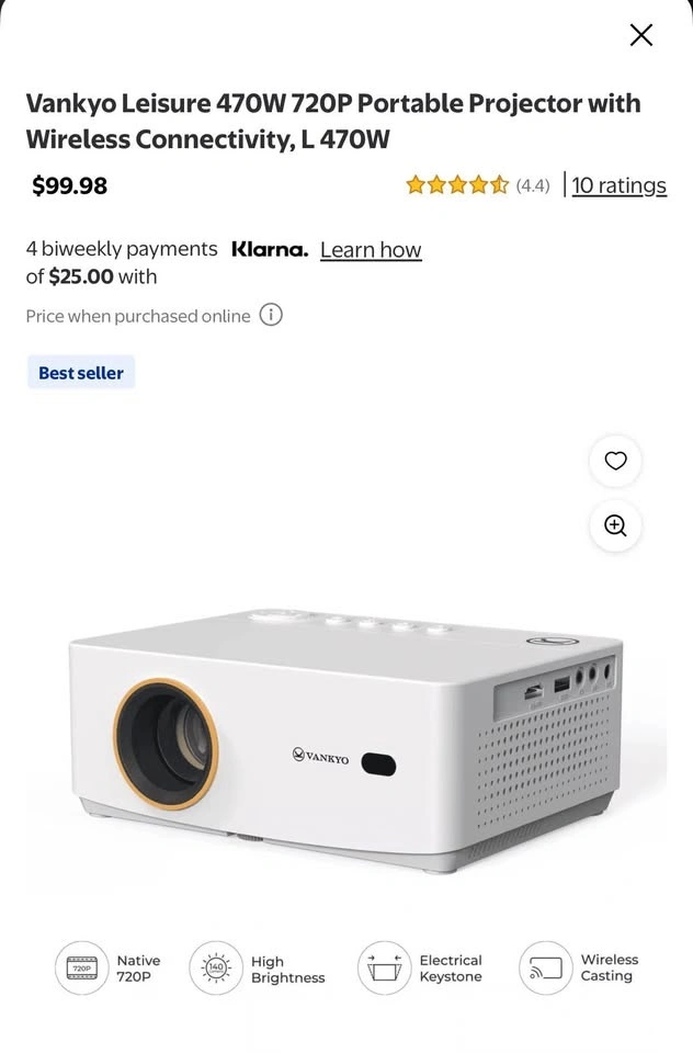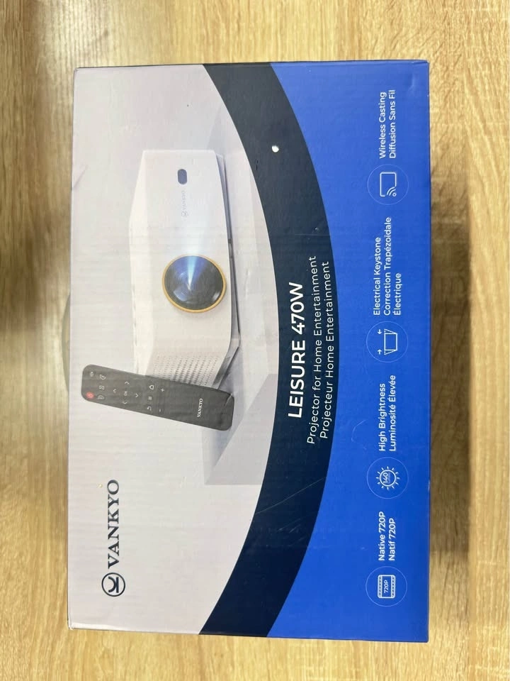The Vankyo Leisure 470W is a compact, portable wireless mini projector that supports 720P HD resolution and can project up to a 250-inch screen size. It uses LED technology with a brightness of 140 lumens and a contrast ratio of 500:1, delivering vibrant colors and sharp visuals.