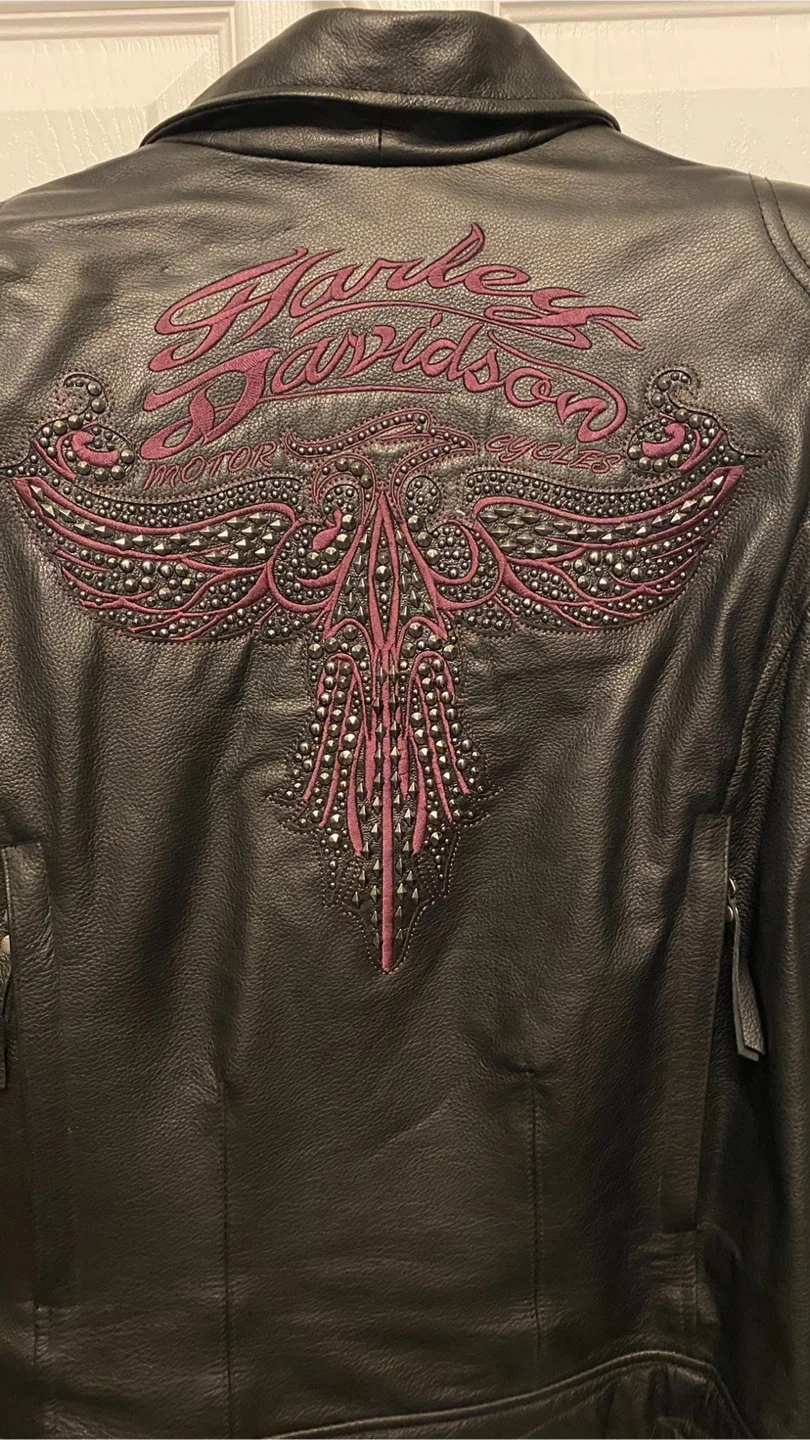 Harley-Davidson leather riding jacket. Black with purple accents and features the Harley-Davidson logo on the back. The body is genuine cowhide leather. It's a stylish and functional piece for any rider!
