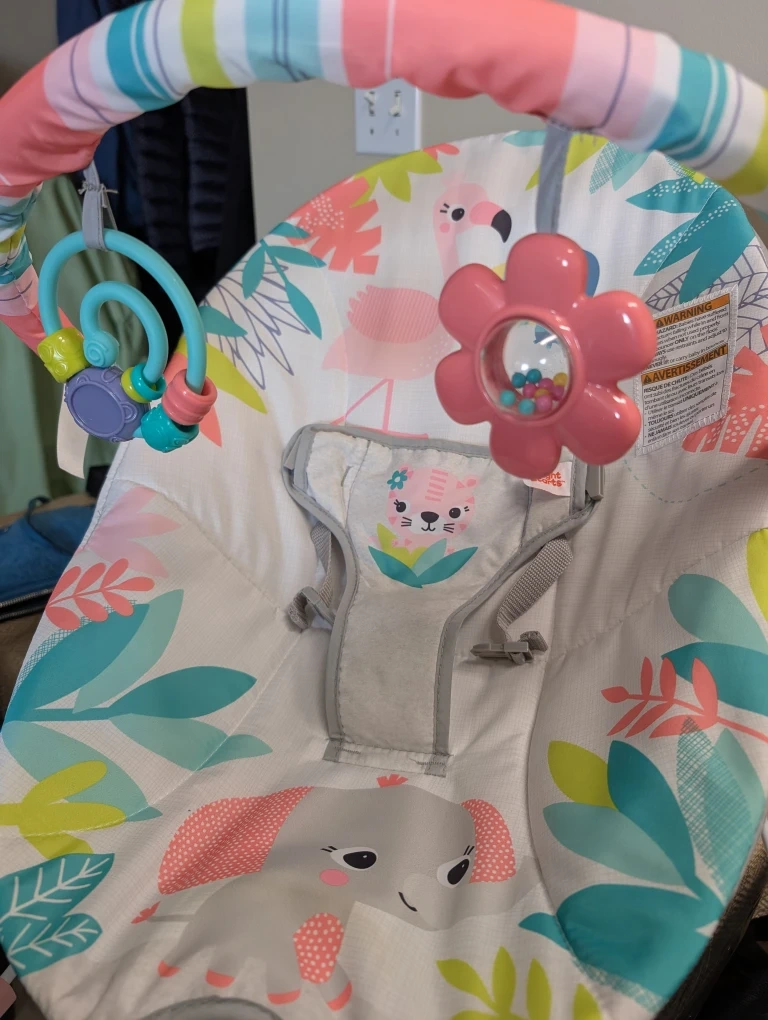 Selling a Bright Starts baby bouncer in good condition. It features a cute design with flamingos and elephants, and includes toys to keep your little one entertained. Perfect for infants!