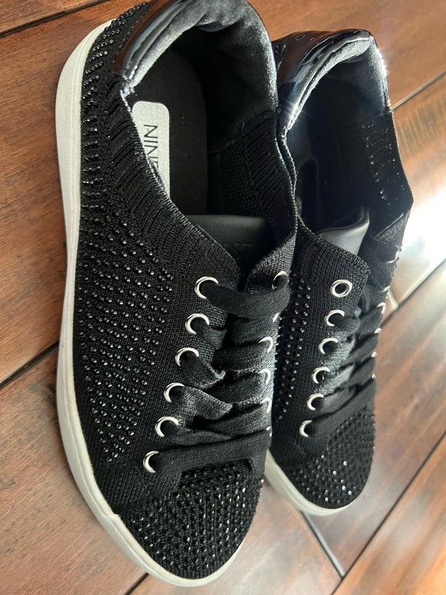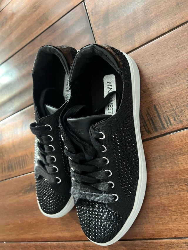 Step out in style with these Nine West black, blinged-out sneakers, perfect for adding a touch of sparkle to your casual wardrobe.