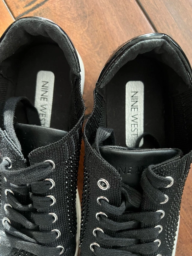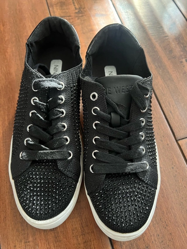 Step out in style with these Nine West black, blinged-out sneakers, perfect for adding a touch of sparkle to your casual wardrobe.