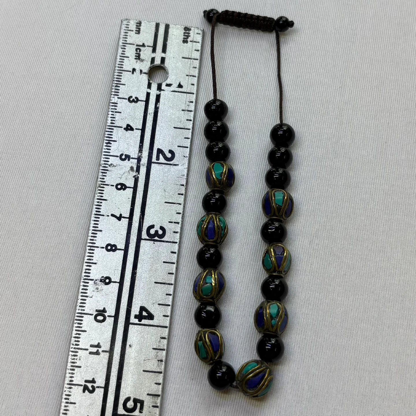 This handcrafted adjustable bracelet features polished black onyx beads paired with ornate brass inlaid beads of turquoise and lapis tones. The combination of earthy metals and vibrant blues and greens gives it a bold, bohemian style suitable for both casual and dressy outfits. Perfect as a statement accessory or a thoughtful gift.