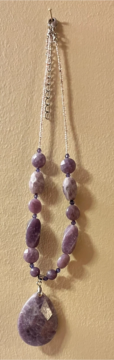 Selling a lovely purple stone pendant necklace. It features a teardrop-shaped pendant and a mix of round and oblong beads. The necklace has a silver-tone clasp and chain for adjustable length. Perfect for adding a touch of elegance to any outfit!