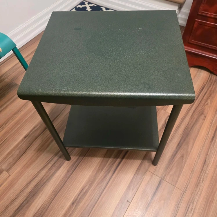 Selling a cute little green side table! It has a shelf underneath for extra storage or decor. It's in good condition and would be perfect for a living room or bedroom