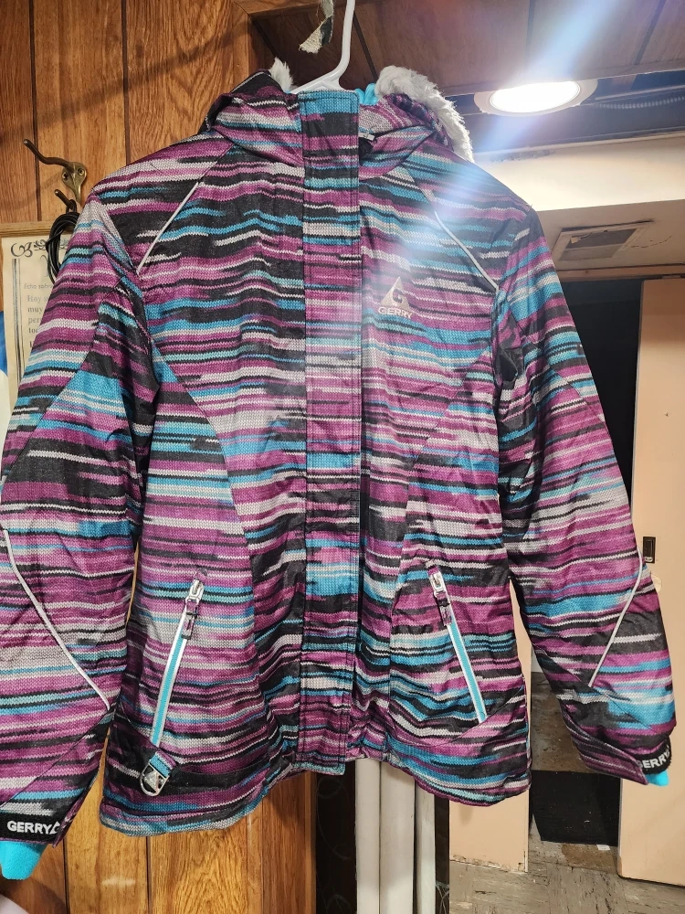 Here's a warm and stylish hooded Gerry winter jacket! It features a fun striped pattern in shades of purple, blue, and black. Perfect for staying cozy and looking great during the colder months size 14 to 16