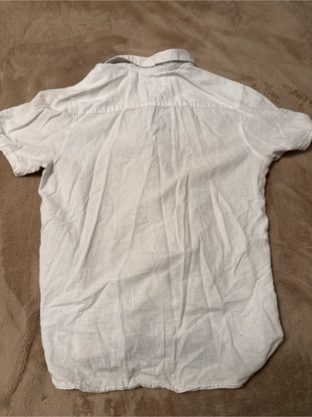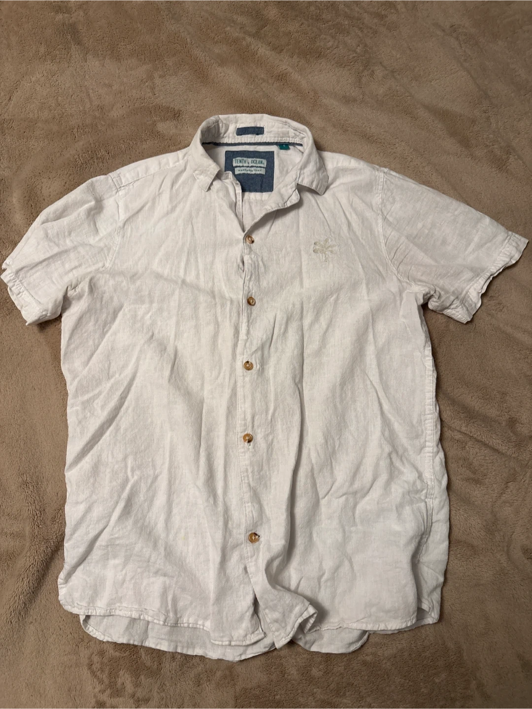Tenth + Ocean white linen t-shirt. Lightweight and breathable, perfect for warm weather. The material is washable linen. Feel free to ask any questions!