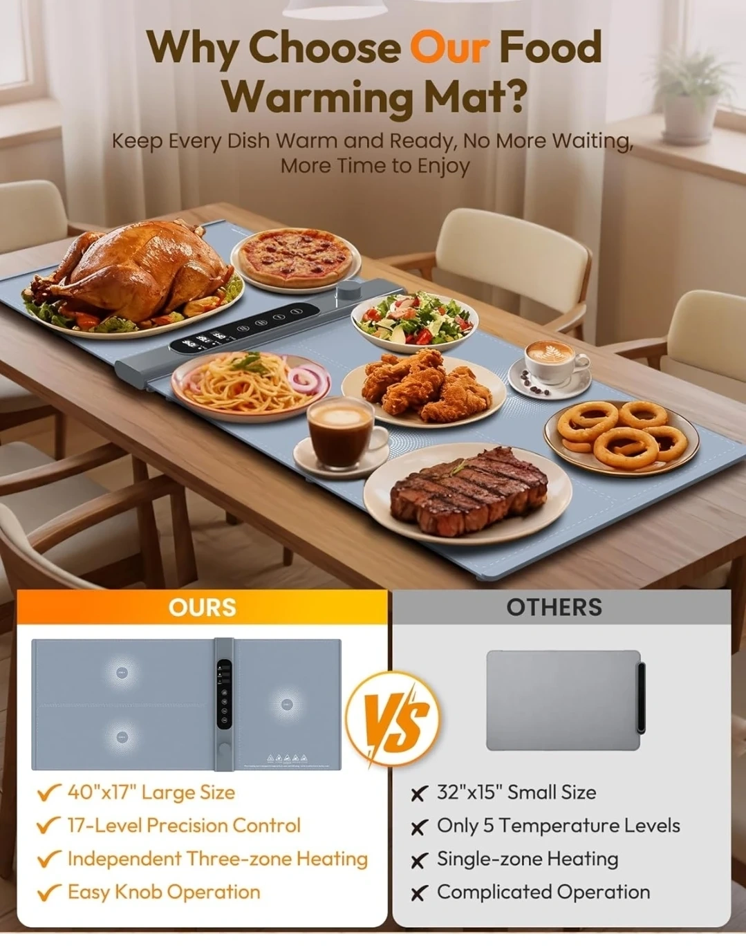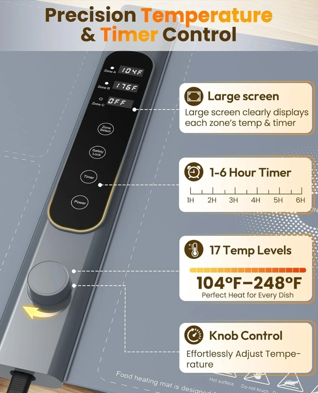 Yeeke 3-Zone Food Warming Mat 40"x17"