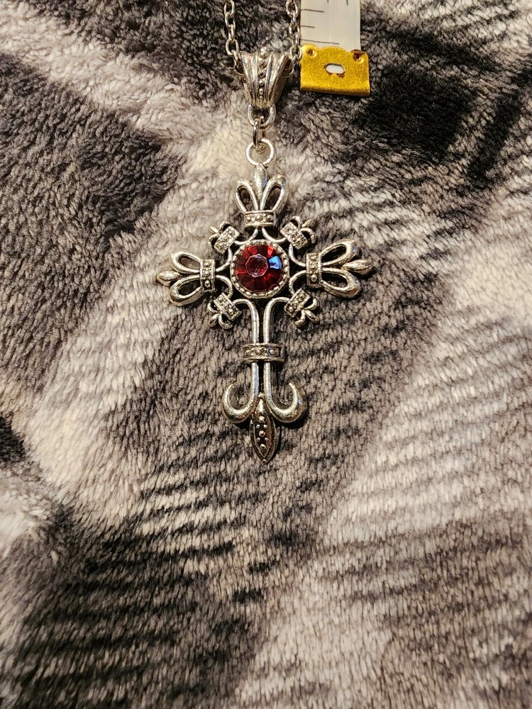 Selling a cross pendant necklace. It features a detailed silver-tone cross design with a striking red stone at the center. The pendant hangs from a delicate chain, making it a beautiful and eye-catching accessory! I have 4