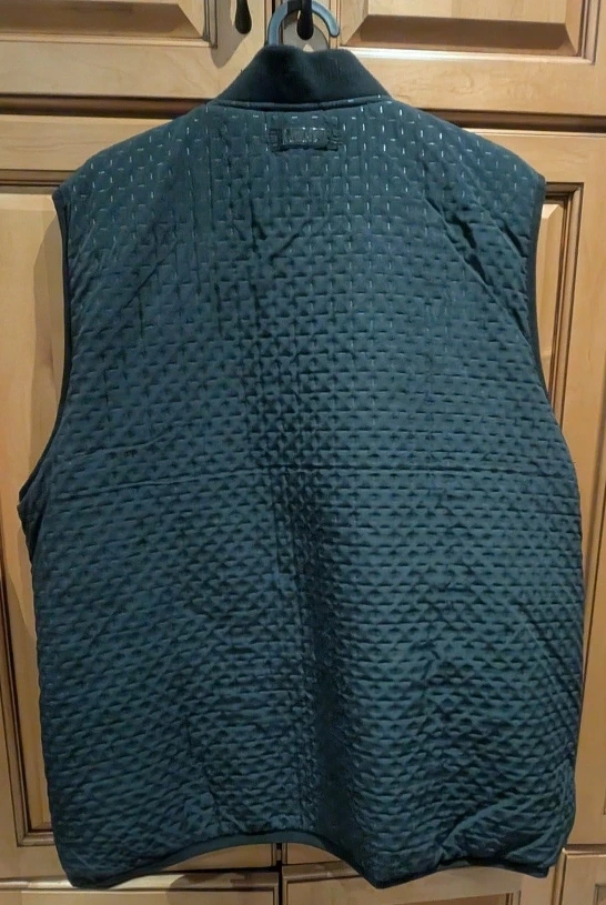 This DKNY Harlan Embossed Vest in size Xlarge has a full zipper front, 3 outer zippered pockets and a hidden interior pocket. Wear this men's quilted vest over your favorite long-sleeve tee or sweater for a layered look that will keep you warm while looking effortlessly stylish. Like new condition as it has never been worn. 100% polyester & machine washable.