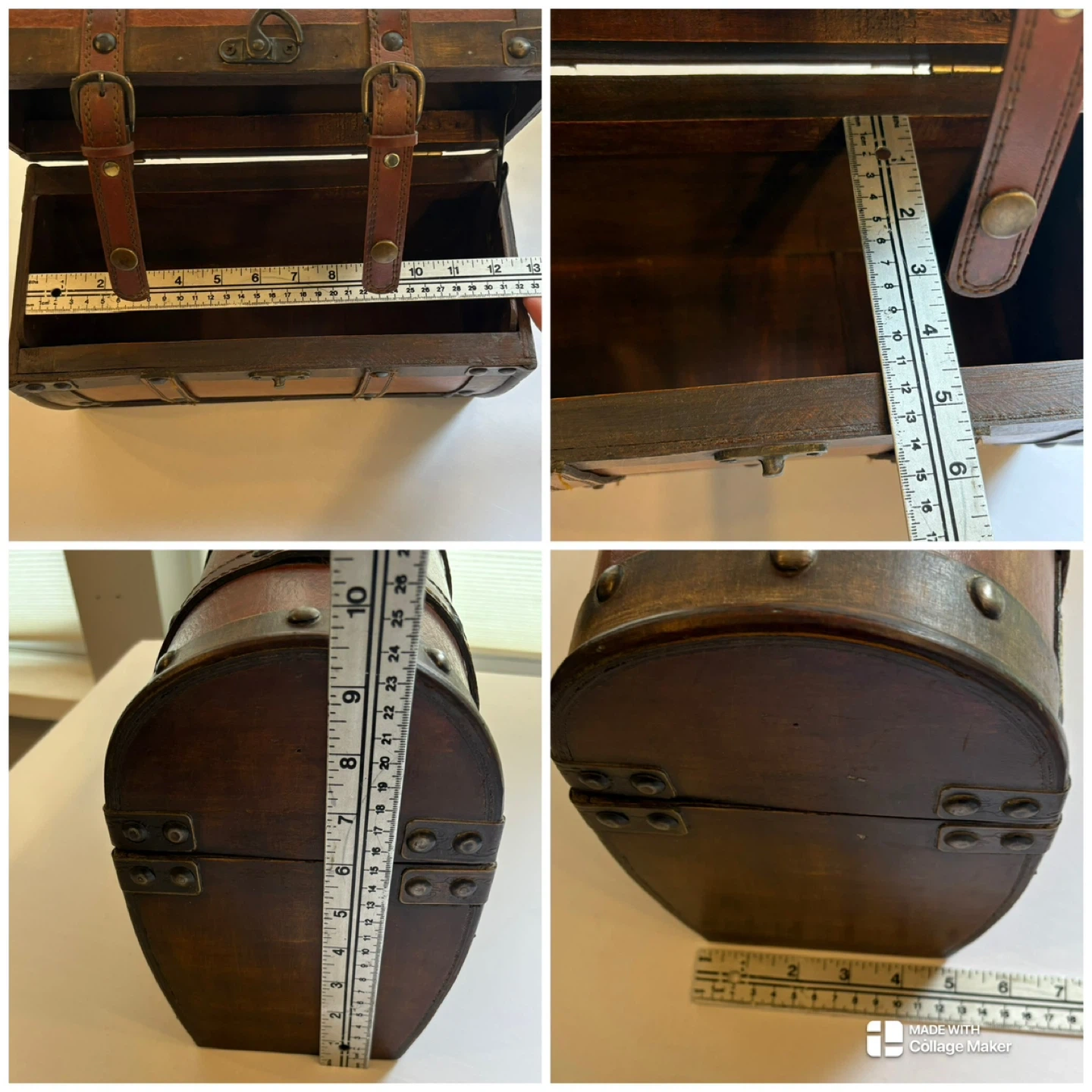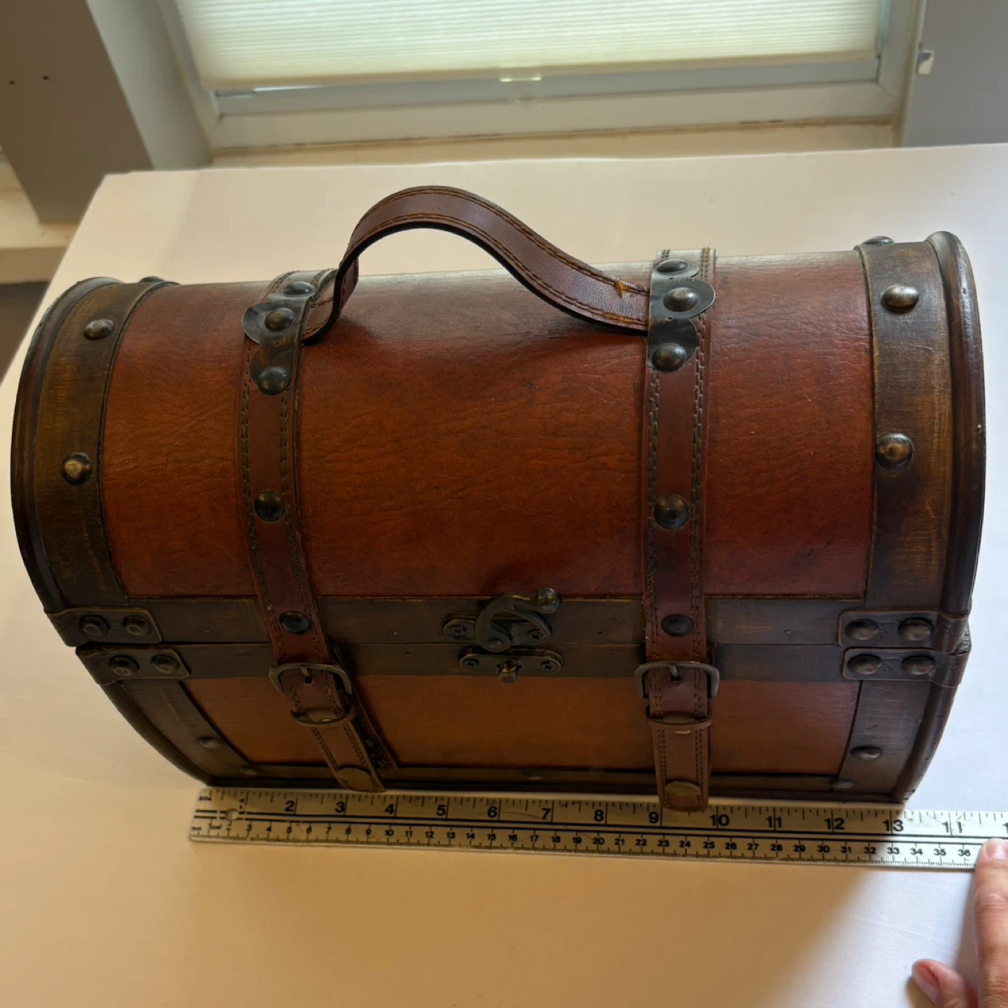 Beautiful decorative wooden chest from Pier 1 Imports featuring a domed lid, faux leather straps, and metal hardware for a classic vintage look. Perfect for use as accent décor, storage for keepsakes, or a stylish way to organize smaller items. Solid and well-crafted with rich warm tones that complement rustic, farmhouse, or traditional interiors.