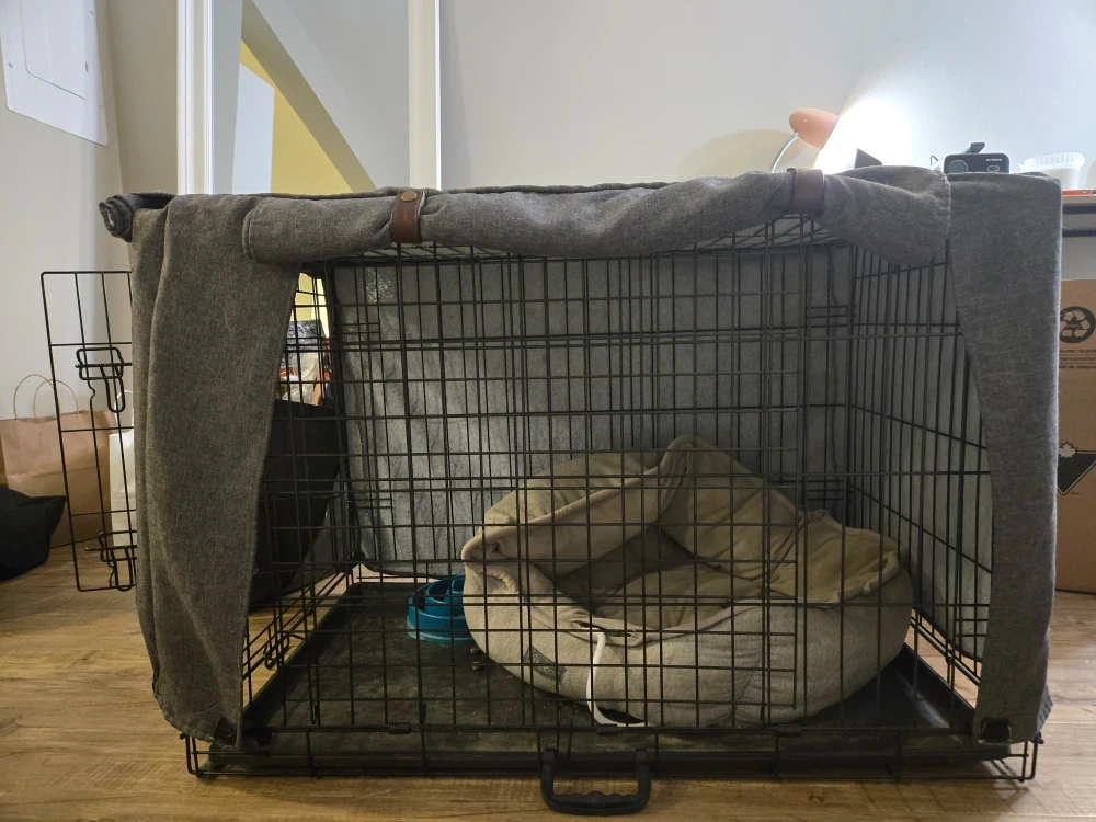 Selling a dog crate that's in great shape! It comes with a grey cover to help your furry friend feel safe and secure. Perfect for training or just giving your dog a comfy space of their own