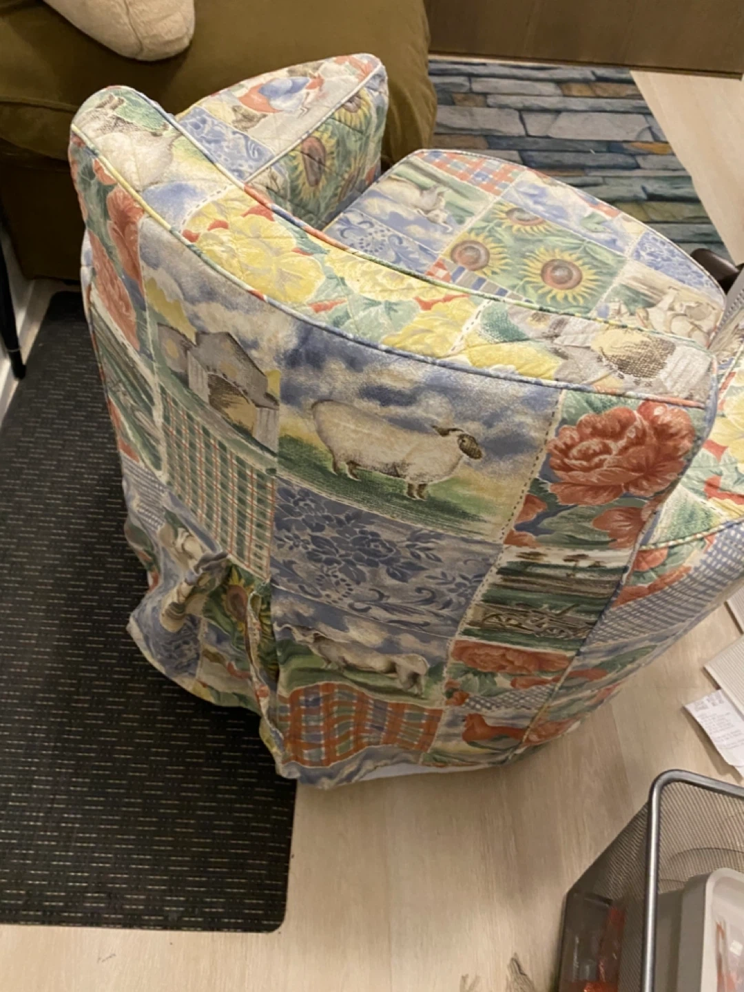 This is a unique barrel chair with a fun, patterned fabric. The fabric features a variety of images like sunflowers, horses, and sheep. It's a swivel chair, so it can rotate 360 degrees. It would make a great addition to any room!