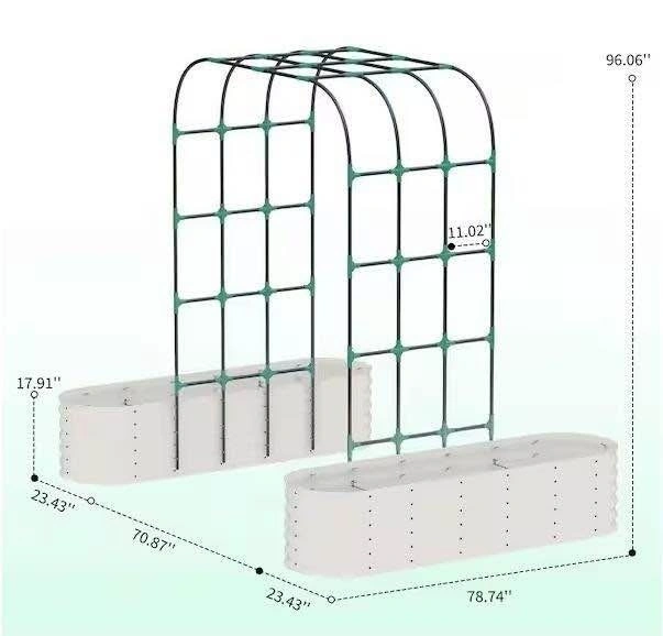 Spacious raised garden bed with dual planters connected by an arch trellis, perfect for climbing plants. Constructed from heavy-duty galvanized steel for long-lasting durability and rust resistance. Open-bottom design promotes healthy root growth and optimal drainage. Elegant beige finish blends seamlessly into garden and patio settings. Arch trellis provides strong vertical support for beans, cucumbers, flowers, and vines.