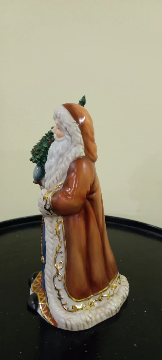 Older style santa figurine, is a china figurine, approx size 4.5 by 7.5 inches, good colors with gold trim. Used for display