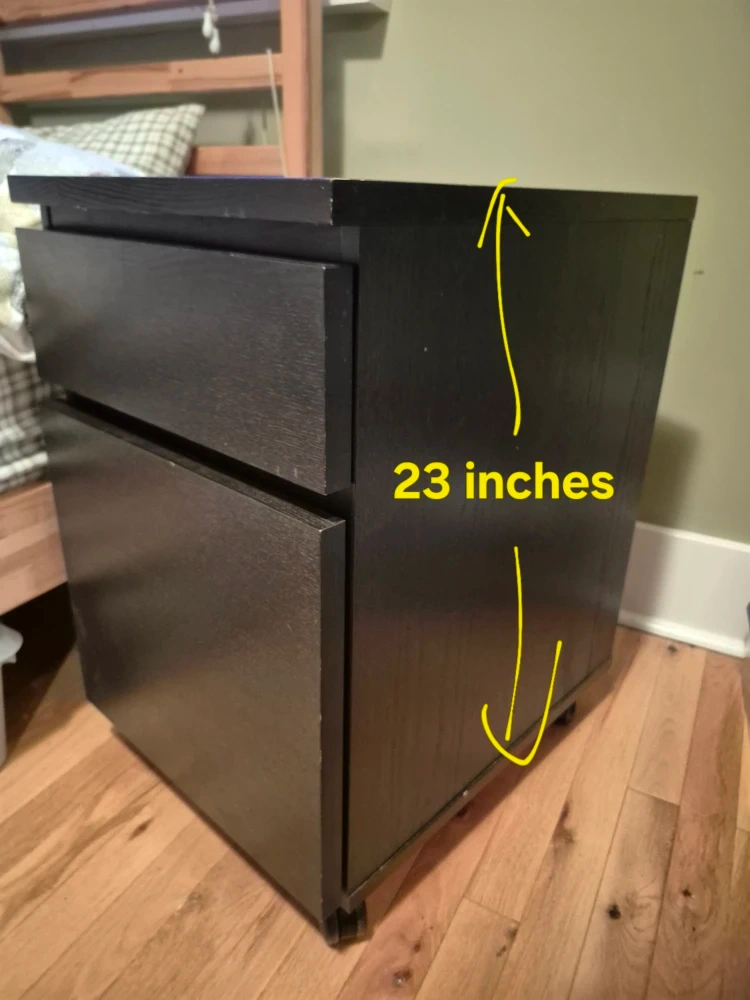 Selling a black rolling file cabinet. It's about 23 inches tall, 16 inches wide, and 20.5 inches deep. Great for home office or extra storage!