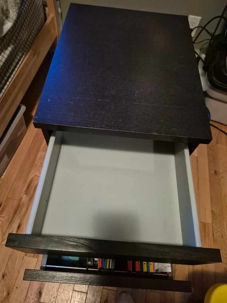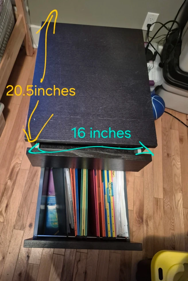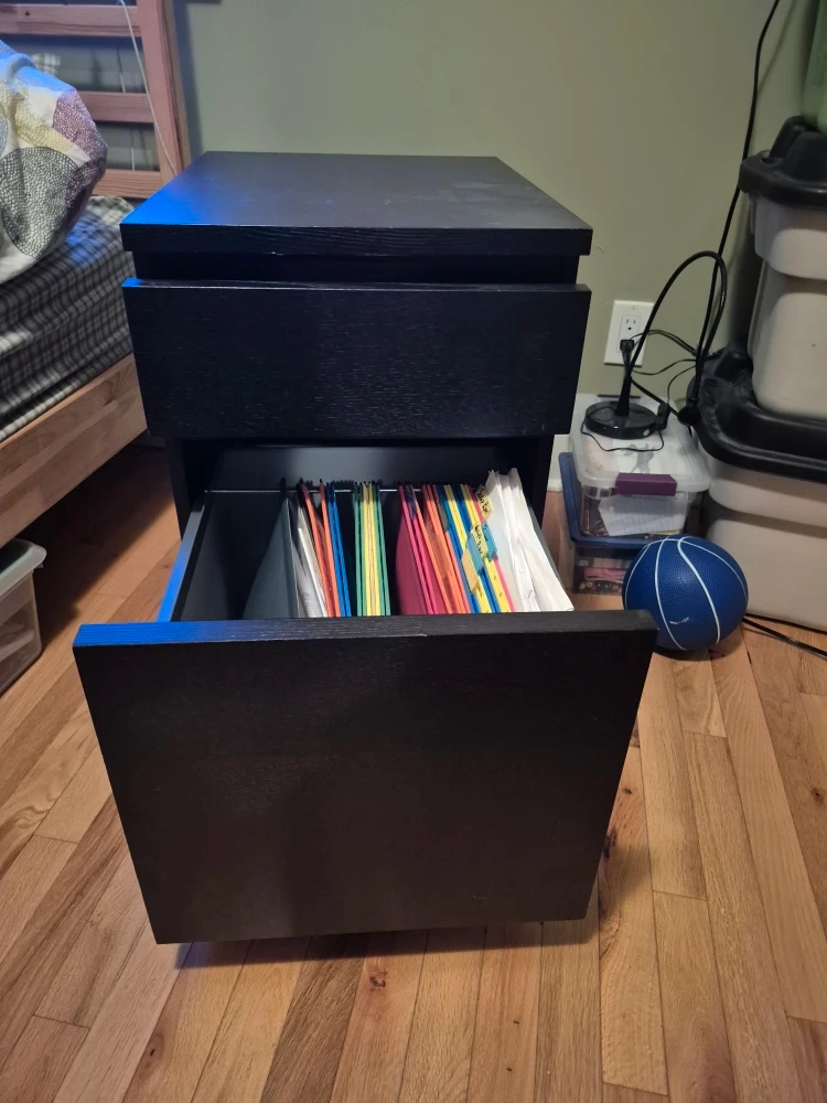 Selling a black rolling file cabinet. It's about 23 inches tall, 16 inches wide, and 20.5 inches deep. Great for home office or extra storage!