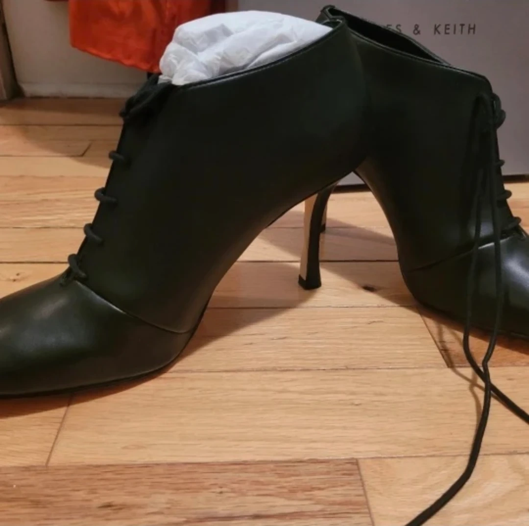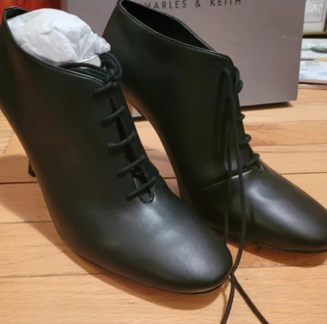 Selling a pair of Charles & Keith lace-up heeled booties in black. They are in great condition and come with the original box. Size 38.