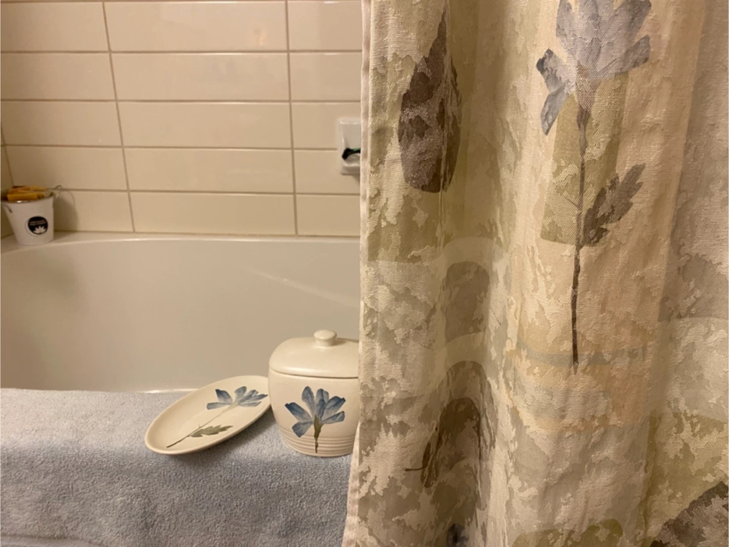 A lovely floral bathroom set that includes a covered container and a small dish. Also included is a matching floral shower curtain to complete the look! Perfect for adding a touch of spring to your bathroom.