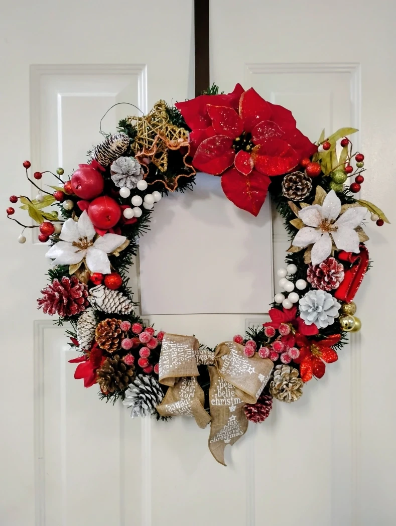 Beautiful brand new handmade Christmas wreath, perfect for adding that warm classic tradition to your home this holiday season! It has a subtle shimmer of red and gold tones decorated with pinecones, berries, apples, and poinsettias. Asking $50
