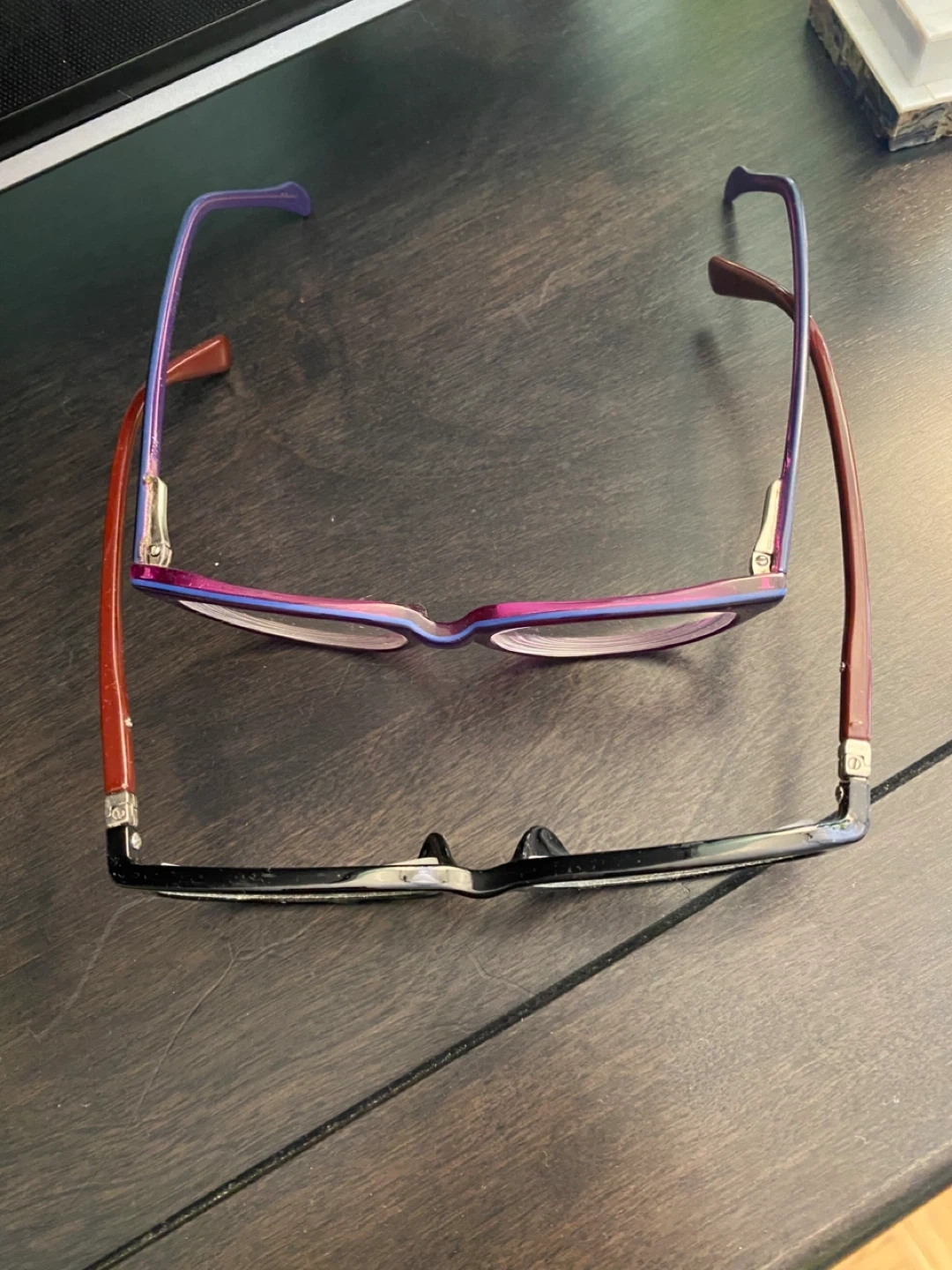 Selling two pairs of glasses! One has a black frame and the other has a purple frame. Both come with their cases and cleaning cloths.