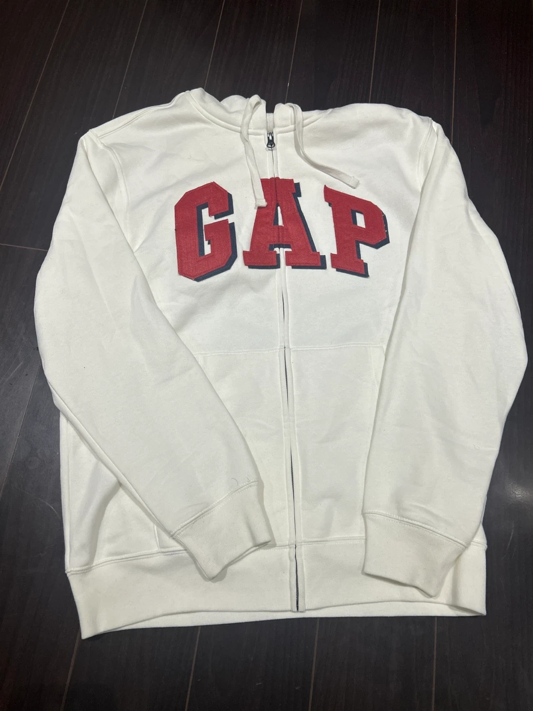 Selling a cozy GAP zip-up hoodie in white! It's a classic and comfortable piece, perfect for layering or wearing on its own. The hoodie features the iconic GAP logo in red. It's in great condition and ready for a new owner!