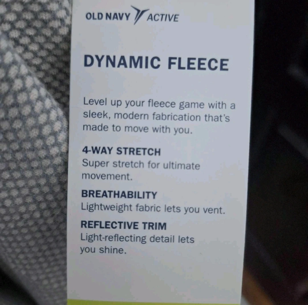Old Navy Active Dynamic Fleece hoodie. It features 4-way stretch for ultimate movement, and lightweight fabric for breathability. The reflective trim adds a nice touch for visibility. Great for workouts or casual wear!