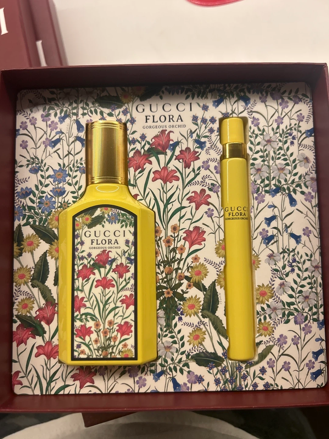 Selling a Gucci Flora Gorgeous Orchid set! This set comes with both the perfume bottle and a travel size spray, perfect for on the go. The box is included as well, making it a great gift or a treat for yourself! 3 sets available