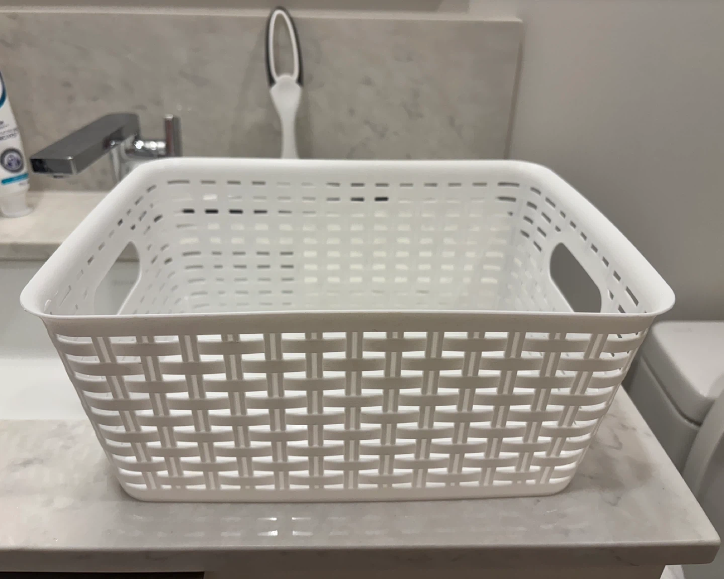 Selling a handy plastic woven basket in great condition. It’s very big, perfect for organizing things in the bathroom, closet, or any space that needs a little tidying up.