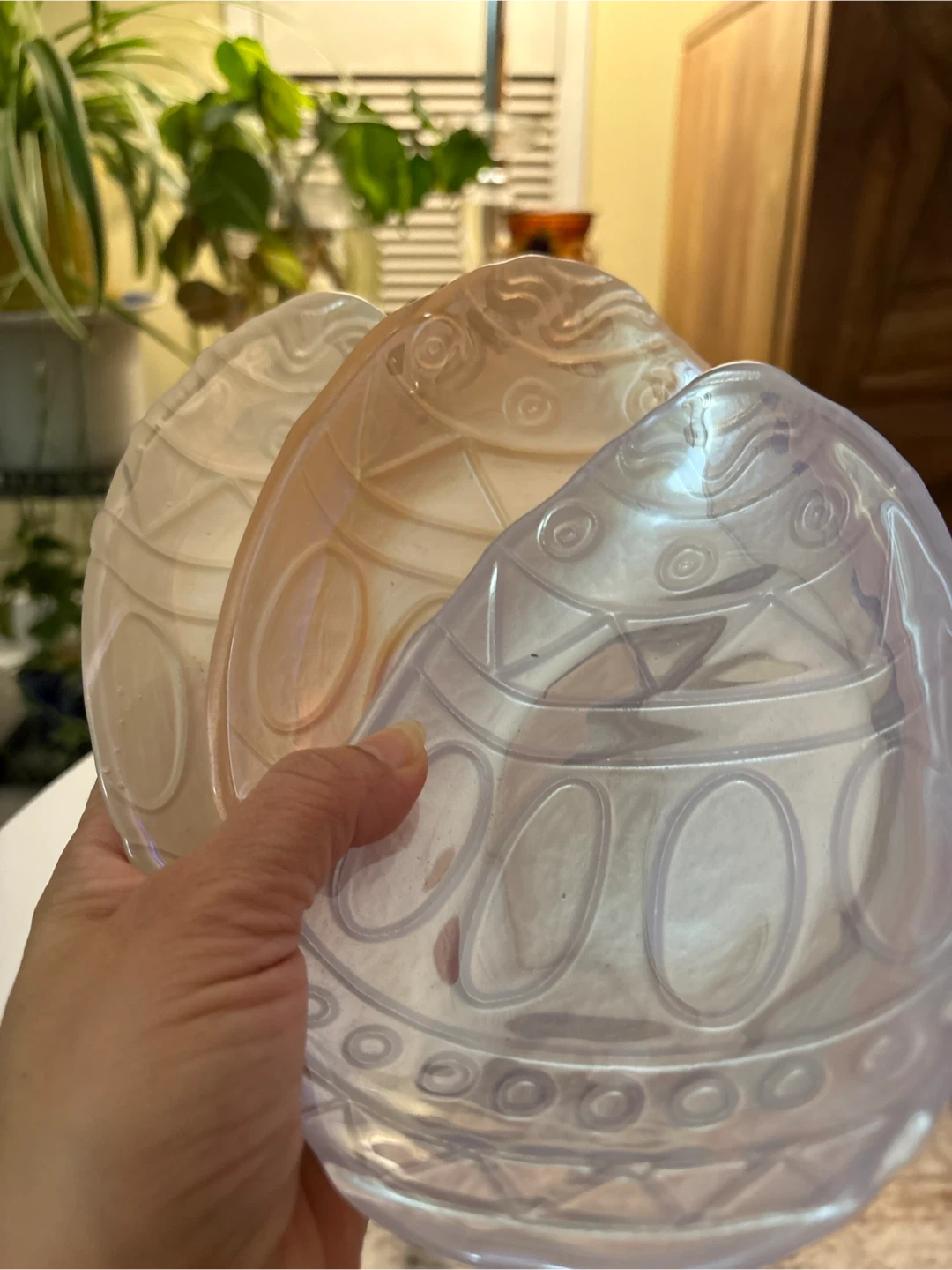 Selling a set of three decorative egg-shaped glass dishes. They feature a lovely iridescent finish and unique design. Perfect for adding a touch of elegance to your home decor!