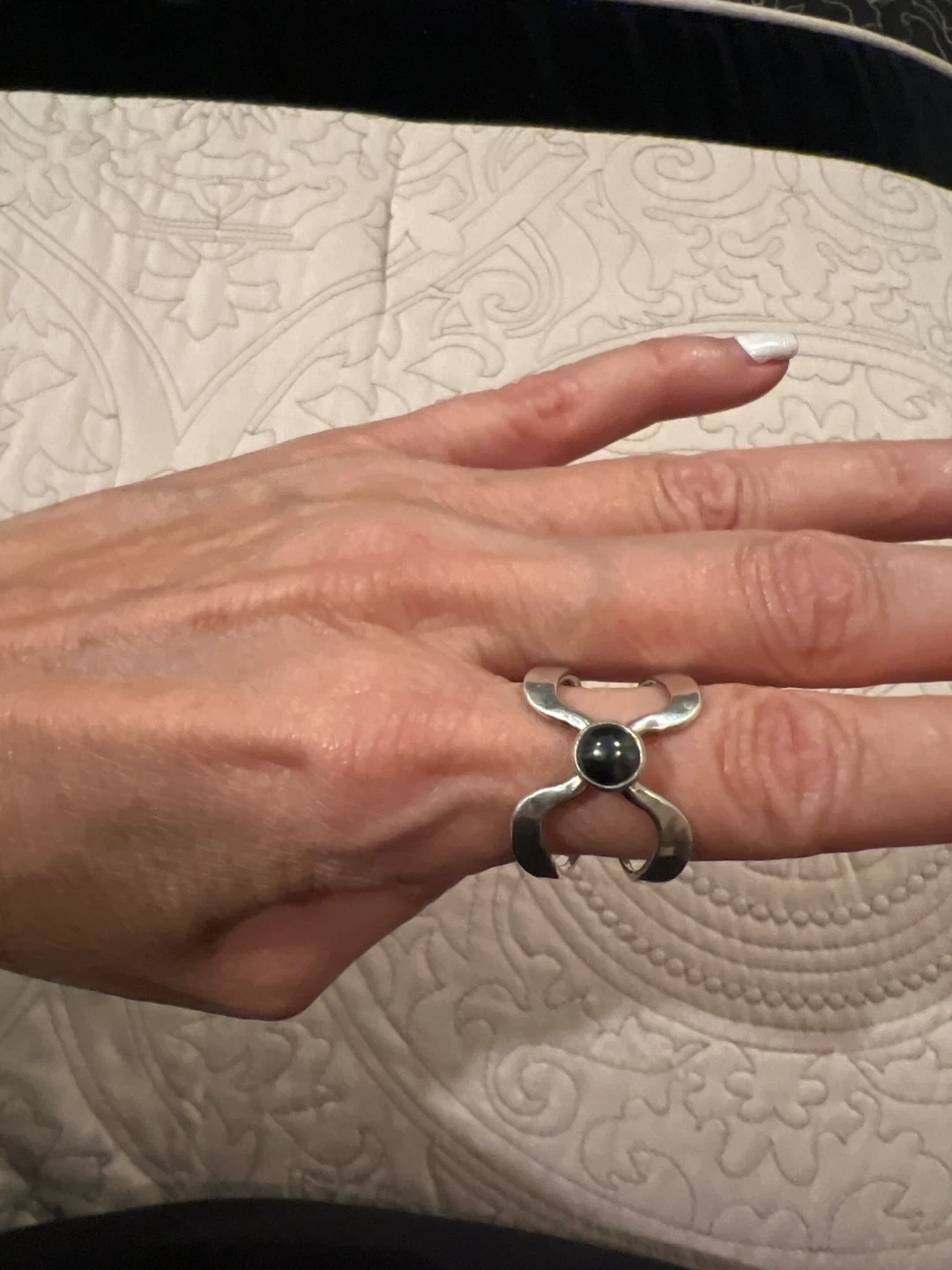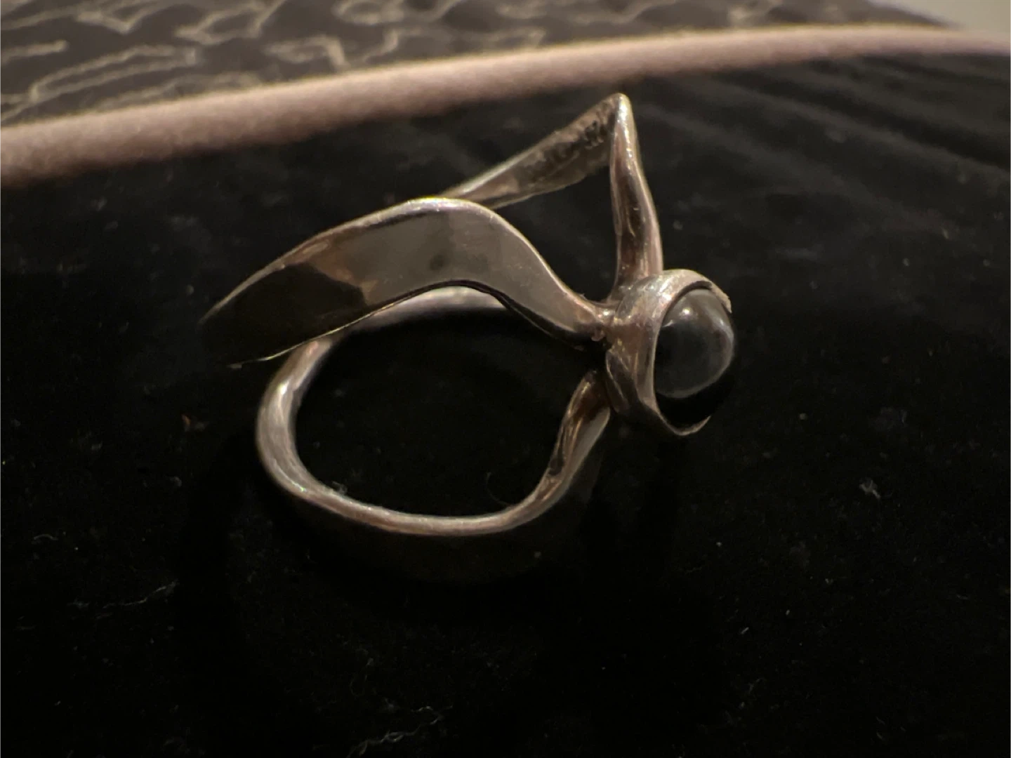 Selling a unique vintage ring! It's crafted from sterling silver and features a striking black stone Like onyx The ring has an interesting design, marked with '925 MEXICO', indicating its sterling silver quality and origin. It's a beautiful piece to add to your jewelry collection!