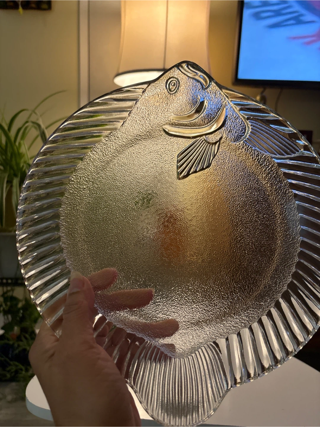 Selling a unique fish-shaped glass plate! It's in great condition and would be a lovely addition to any table setting.