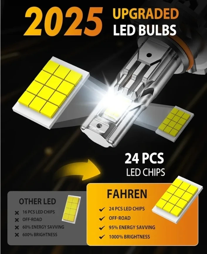 New set of Fahren 9005 LED Headlight Bulbs. They are 80,000LM 1200% Ultra-Bright, with a 1:1 Size Wireless HB3 design. These headlight bulbs feature 6500K Cool White light and are plug and play. They have a lifespan of 10 years, or 70000+ hours of non-stop lighting, and a silent turbofan for cooling. They are made with an all-in-one aviation aluminum body. The bulbs are designed to be 1200% brighter than halogen bulbs