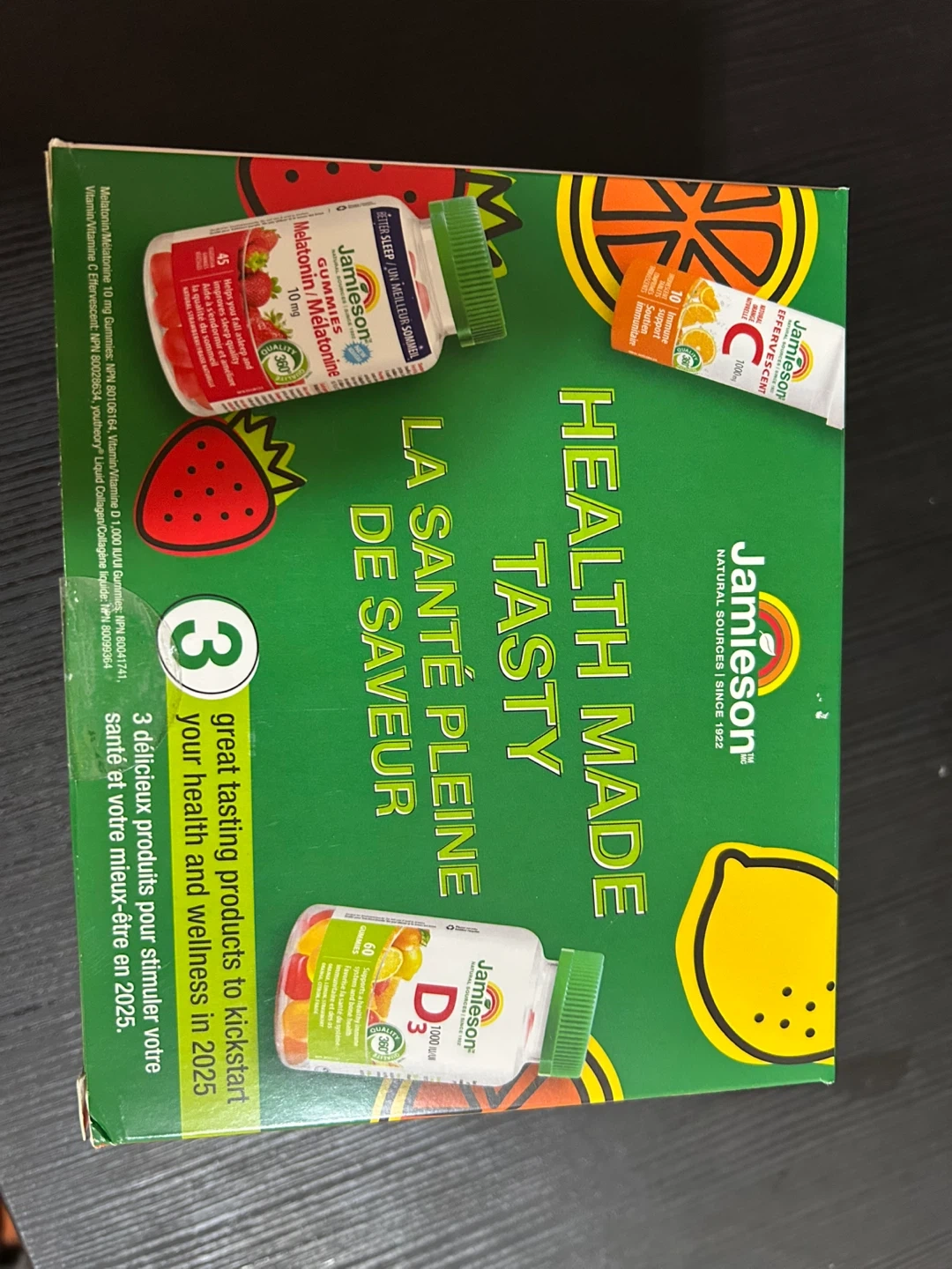 I'm selling a new box of Jamieson Health Made Tasty Gummies! This box includes Melatonin 10mg gummies, Vitamin C effervescent, and Vitamin D 1000IU gummies. Great tasting products to kickstart your health and wellness in 2025. The expiration date is December 2025