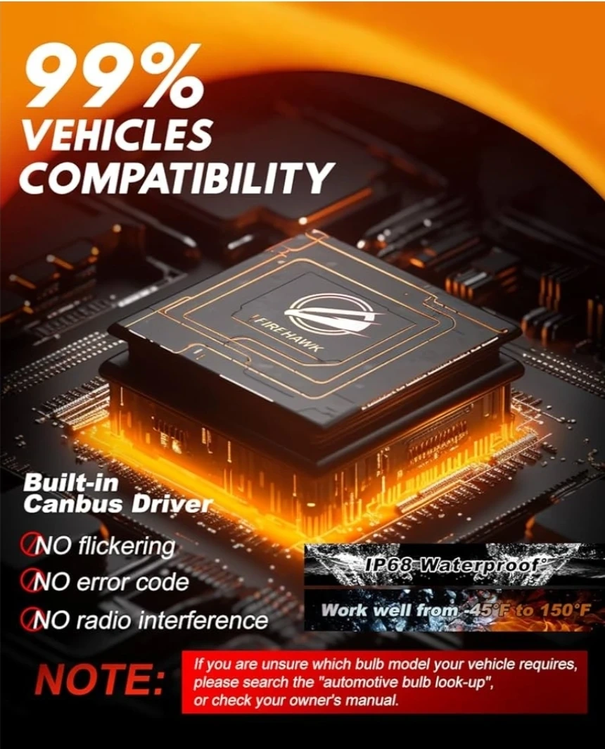 They are designed with an advanced cooling system for long-lasting performance (over 90,000 hours) and feature a silent turbo fan. The bulbs also have anti-glare tech and no dark spots or shadows for safer driving with +350% night vision.