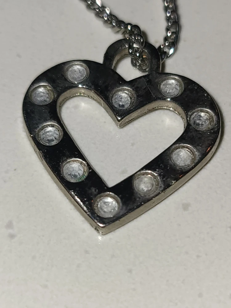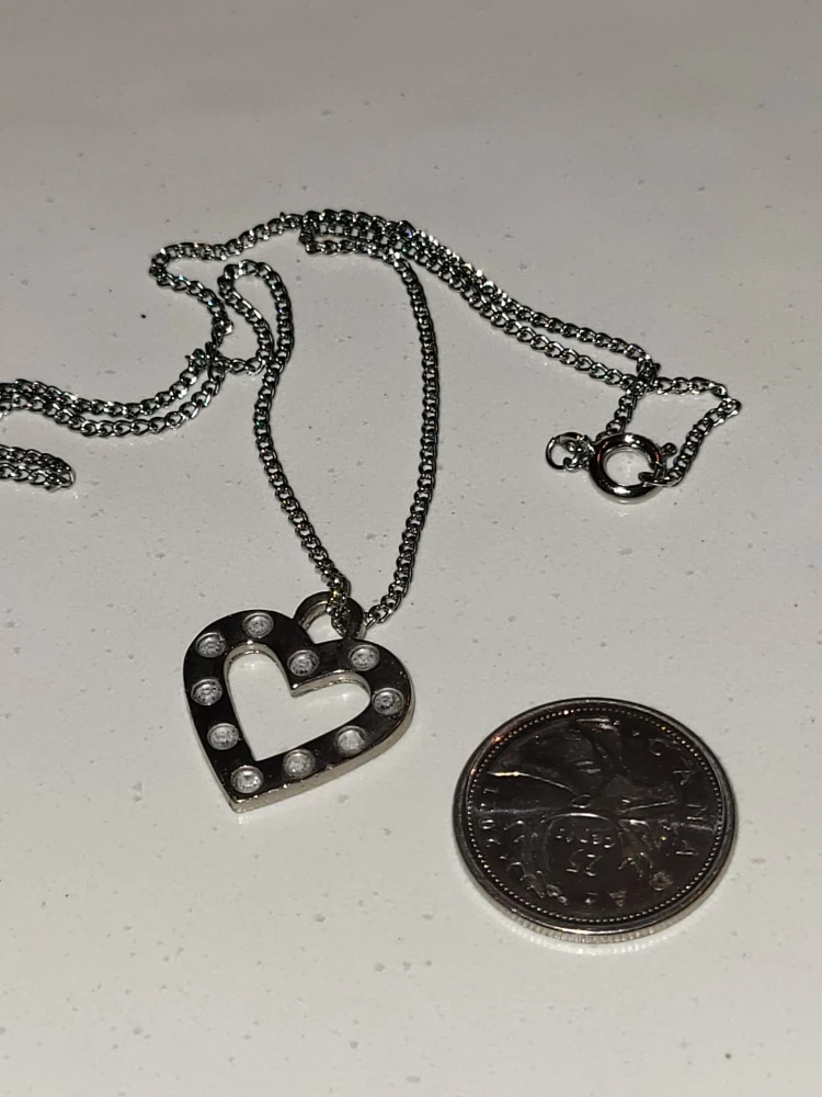 Selling a heart pendant necklace. It's a simple and sweet piece that would make a great addition to your jewellery collection. The heart pendant has small stones set around the edge. It's in good condition and ready to wear.