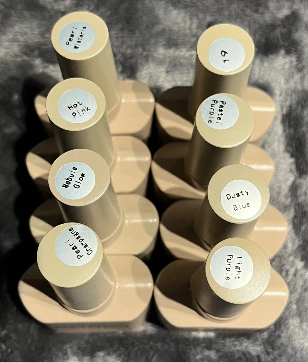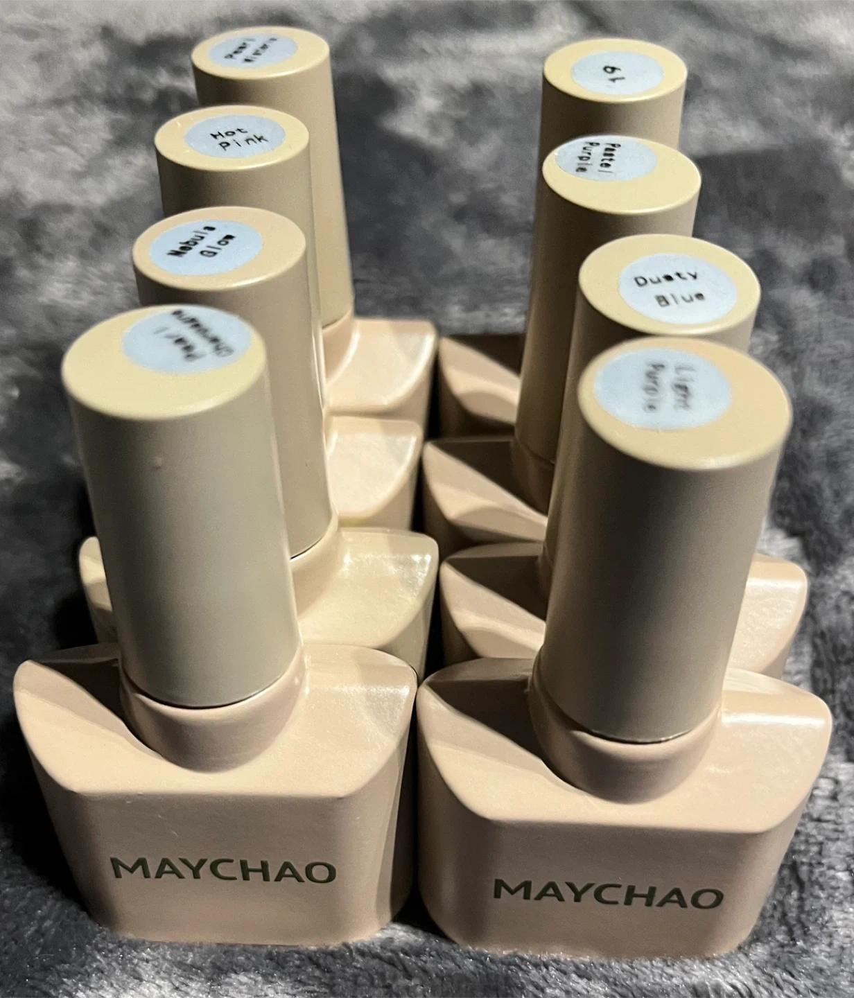 Selling a set of Maychao nail polishes in various colours. The colours include Pearl Champagne, Nebula Glow, Hot Pink, Pearl Wisteria, Pastel Purple, Light Purple and Dusty Blue. Add some colour to your life!