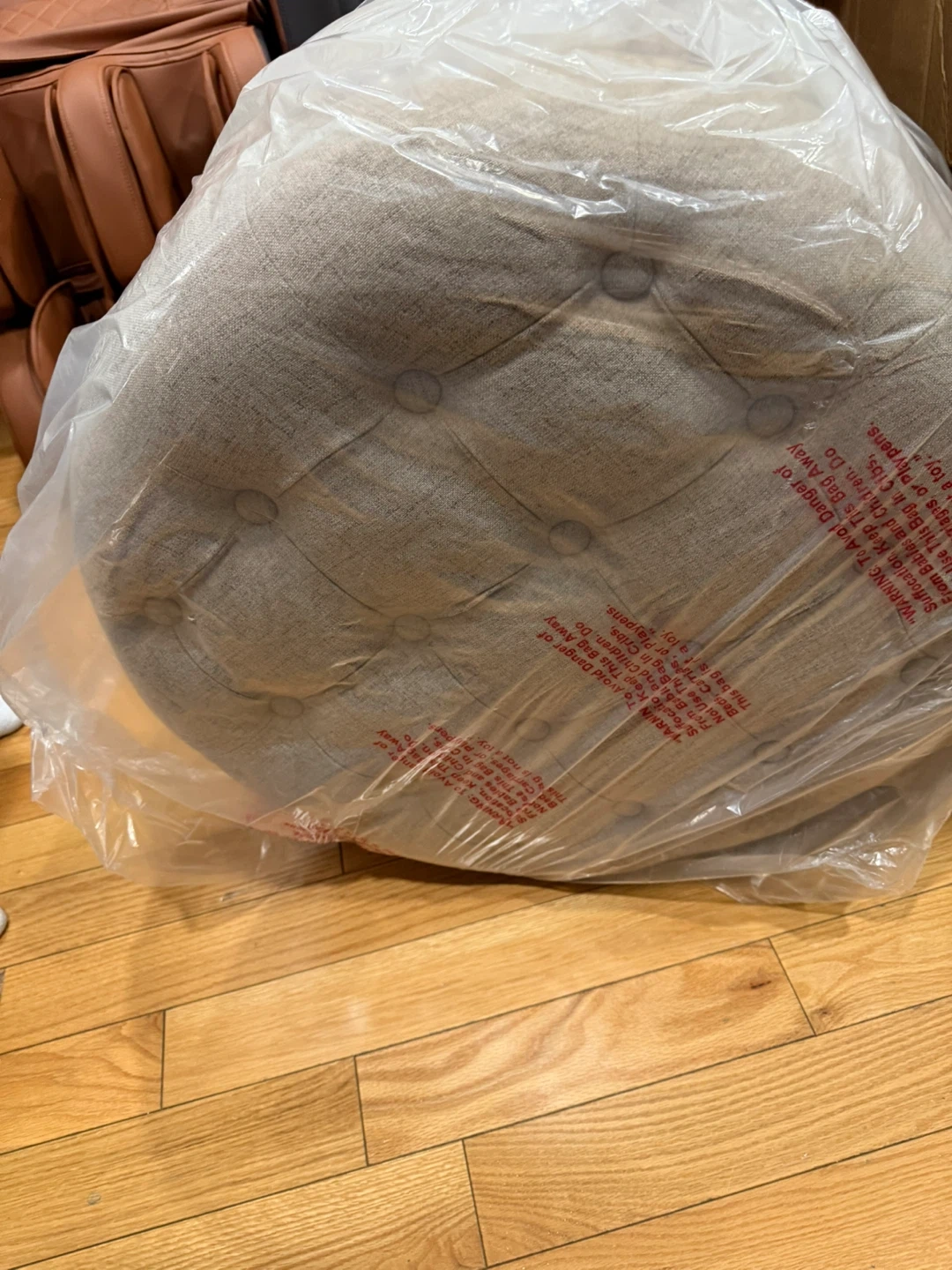 Selling a round tufted ottoman in a light tan color. It's in great condition and ready to add a touch of elegance to your living space!