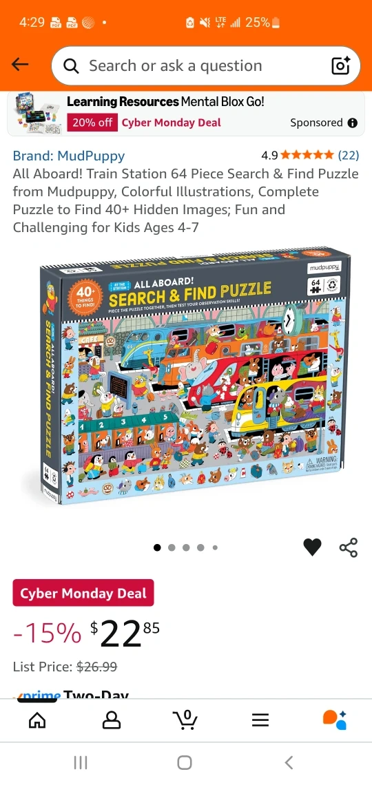 I'm selling a Mudpuppy All Aboard! Search & Find Puzzle. It's a 64-piece puzzle with colourful illustrations. Great for kids ages 4-7 to find hidden images and test their observation skills! The box is included.