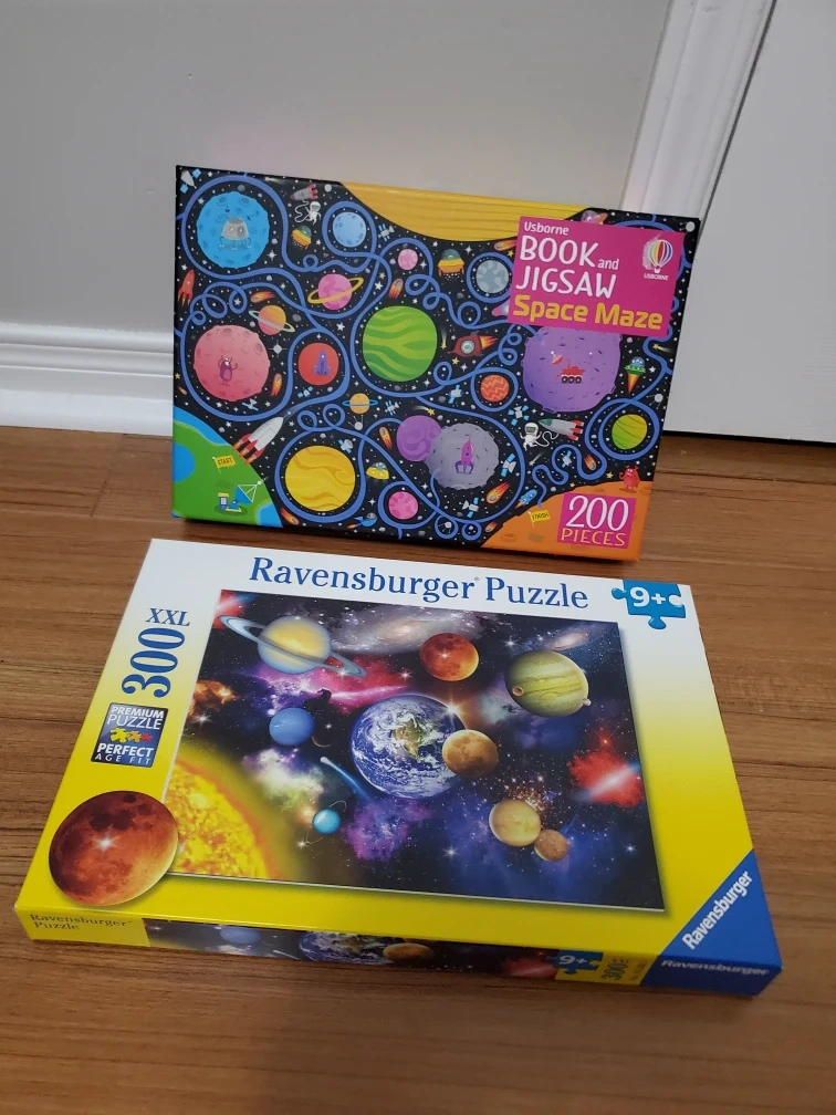 Selling two space-themed puzzles! One is a Ravensburger XXL 300-piece puzzle and the other is an Usborne Book and Jigsaw Space Maze with 200 pieces. Both puzzles are in great shape and ready for a new home!