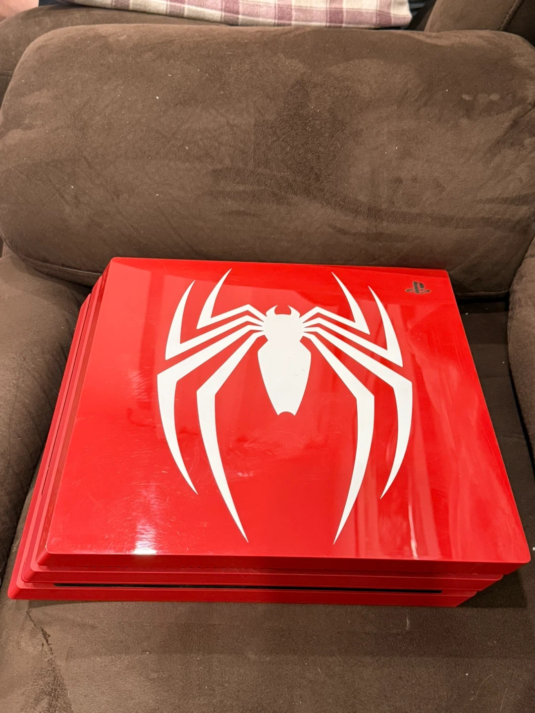 Selling a PlayStation 4 Pro Spider-Man Edition in red! It comes with a matching red controller and three games: Resident Evil Village, Back 4 Blood Ultimate Edition, and Borderlands 3 Super Deluxe Edition